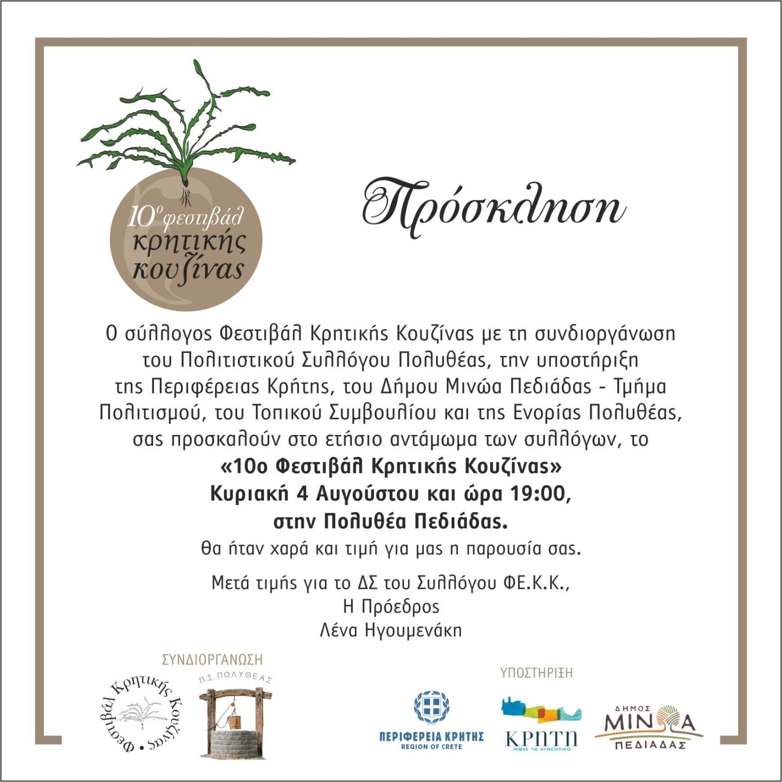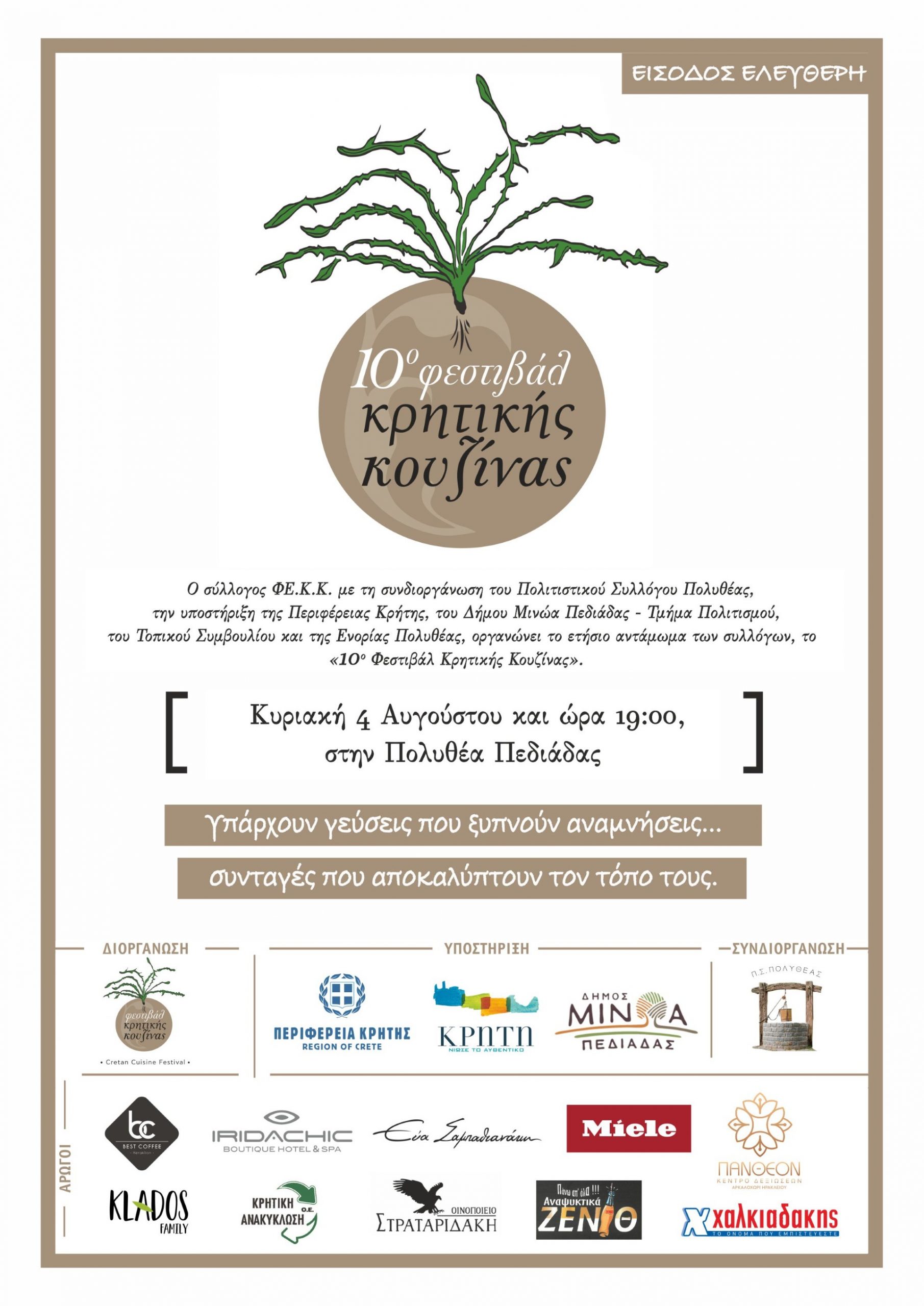 Ο Σύλλογος Φεστιβάλ Κρητικής Κουζίνας με τη συνδιοργάνωση του Πολιτιστικού Συλλόγου Πολυθέας, την υποστήριξη της Περιφέρειας Κρήτης, του Δήμου Μινώα Πεδιάδας, του Τοπικού Συμβουλίου και της Ενορίας Πολυθέας σας προσκαλούν στο 10ο Φεστιβάλ Κρητικής Κουζίνας, την Κυριακή 4 Αυγούστου, στις 7 το απόγευμα, στην Πολυθέα Πεδιάδας.