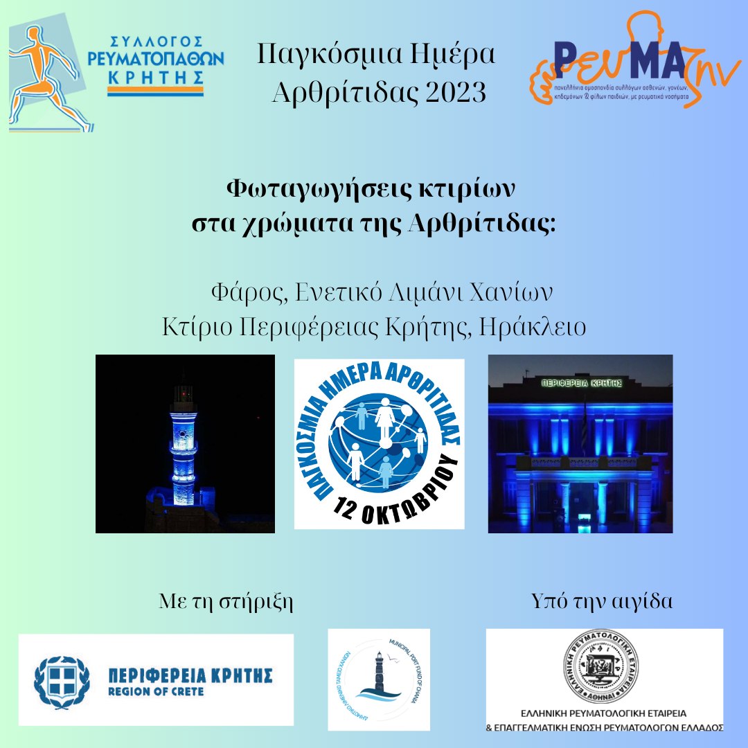 Η Πανελλήνια Ομοσπονδία ΡευΜΑζήν δίνει και φέτος το παρών, οργανώνοντας πανελλαδικά φωταγωγήσεις στα χρώματα της Αρθρίτιδας (μπλε) σημαντικών κτιρίων και μνημείων στις πόλεις έδρες των συλλόγων μελών της, την Πέμπτη 12/10/2022 στις 19:00.