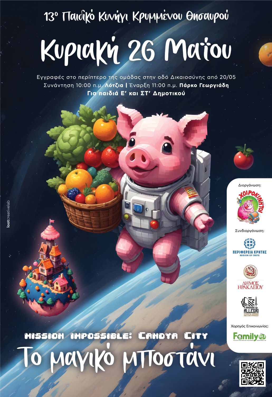 Η ομάδα «Χοιροκίνητοι», υπό την αιγίδα του Δήμου Ηρακλείου, συνδιοργανώνει με την Περιφέρεια Κρήτης το 13ο Παιδικό Κυνήγι Κρυμμένου Θησαυρού. Το παιχνίδι θα πραγματοποιηθεί την Κυριακή 26 Μαΐου 2024, στο πάρκο Γεωργιάδη, από τις 11:00 έως τις 14:00, και απευθύνεται σε παιδιά της Ε’ και ΣΤ’ δημοτικού.