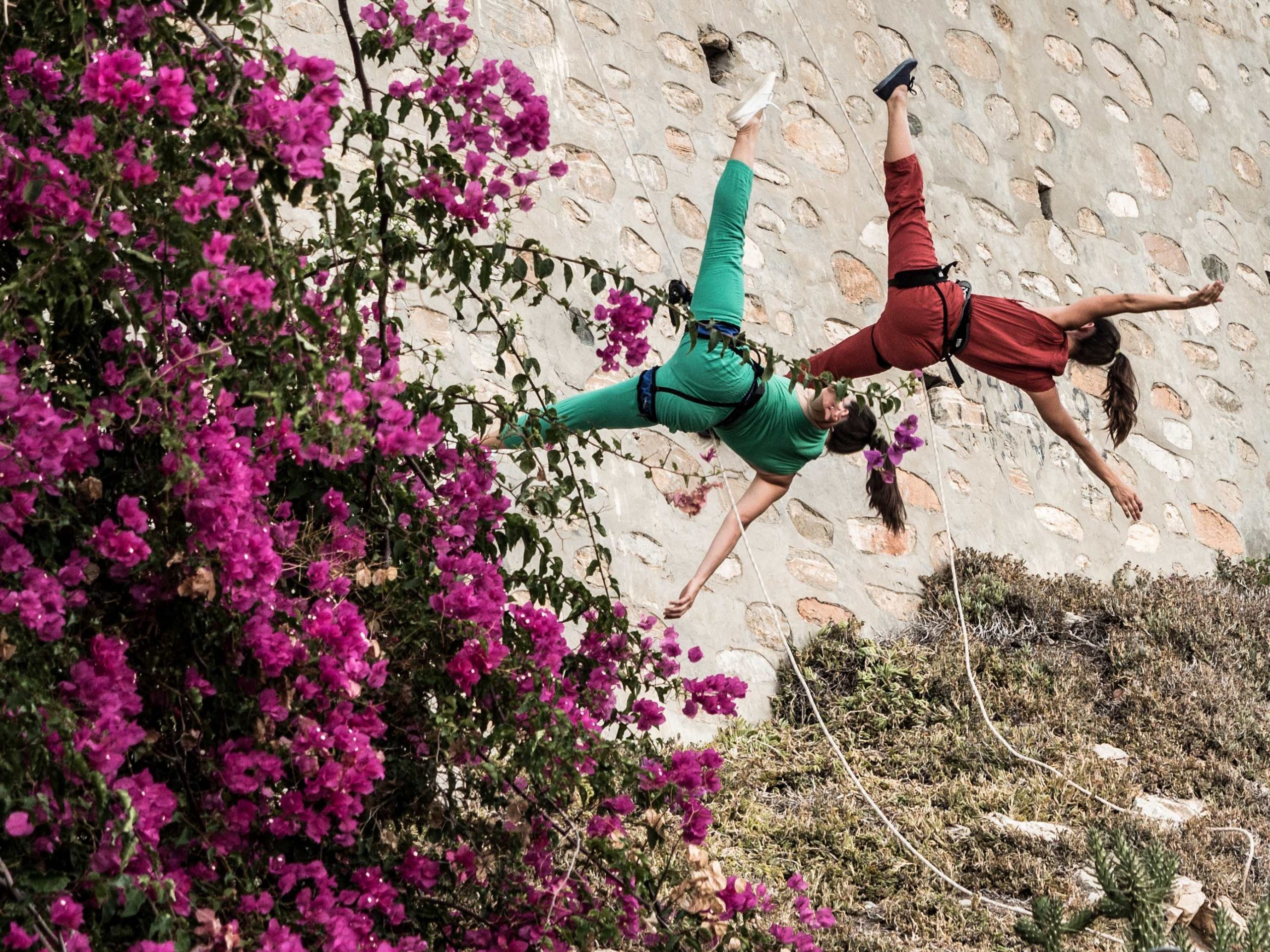 Two bodies are suspended on ropes. Their movement mirrors and connects to the waters around them, holding on to the notion that we are created in water and made of water. The attachment of the rope coming from the center of the body acts as an umbilical cord and the architecture which is danced on becomes the mother. Like the swells of the sea an action in one place can be seen or felt thousands of miles away.