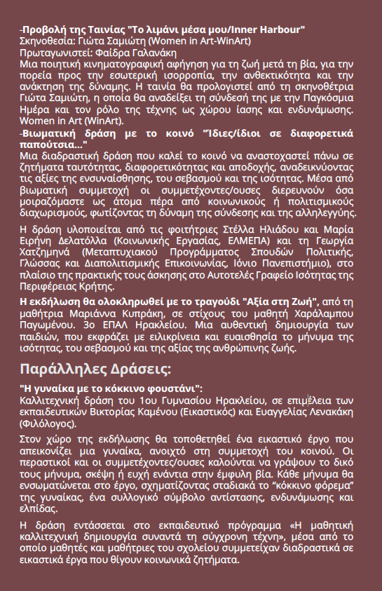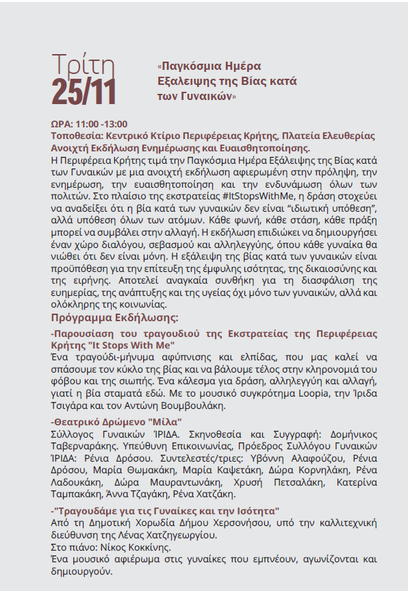 Οι δράσεις ξεκινούν στις 25 Νοέμβριου 2025, «Παγκόσμια Ημέρα Εξάλειψης της Βίας κατά των Γυναικών, με την Ανοιχτή Εκδήλωση Ενημέρωσης και Ευαισθητοποίησης που θα πραγματοποιηθεί έξω από το Κεντρικό Κτίριο της Περιφέρειας Κρήτης, 11:00π.μ.- 1:00μ.μ.