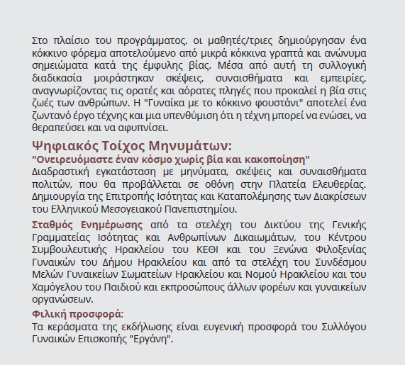 Η δράση εντάσσεται στο εκπαιδευτικό πρόγραμμα «Η μαθητική καλλιτεχνική δημιουργία συναντά τη σύγχρονη τέχνη», μέσα από το οποίο μαθητές και μαθήτριες του σχολείου συμμετείχαν διαδραστικά σε εικαστικά έργα που θίγουν κοινωνικά ζητήματα. Στο πλαίσιο του προγράμματος, οι μαθητές/τριες δημιούργησαν ένα κόκκινο φόρεμα αποτελούμενο από μικρά κόκκινα γραπτά και ανώνυμα σημειώματα κατά της έμφυλης βίας. Μέσα από αυτή τη συλλογική διαδικασία μοιράστηκαν σκέψεις, συναισθήματα και εμπειρίες, αναγνωρίζοντας τις ορατές και αόρατες πληγές που προκαλεί η βία στις ζωές των ανθρώπων.