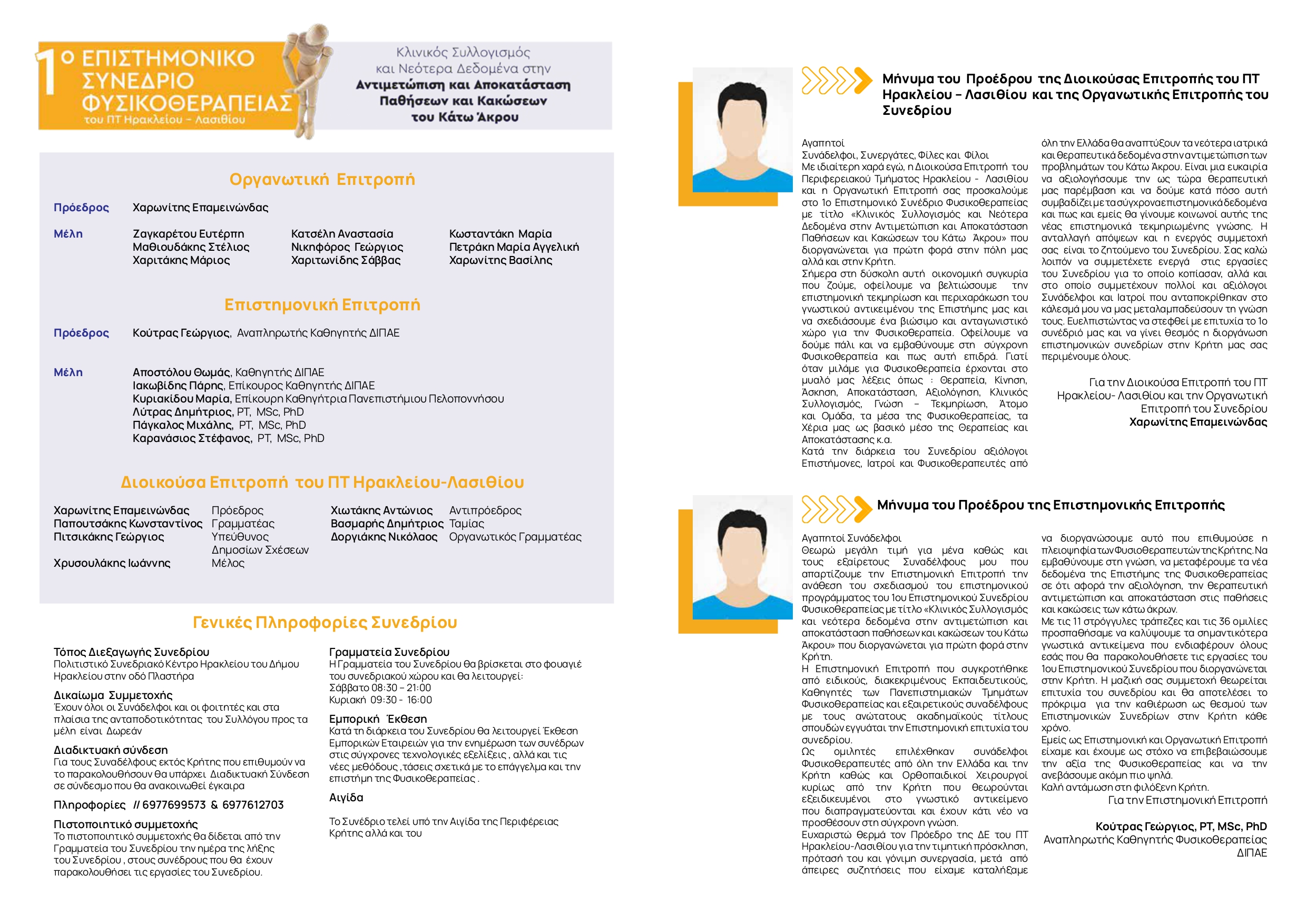 Φιλοδοξία μας είναι η επιτυχία του 1ου Συνεδρίου Φυσικοθεραπείας να είναι η απαρχή της καθιέρωσης ως θεσμού των Επιστημονικών Συνεδρίων Φυσικοθεραπείας και όχι μόνο στην Κρήτη μας» αναφέρει σε ανακοίνωση του το περιφερειακό τμήμα.
