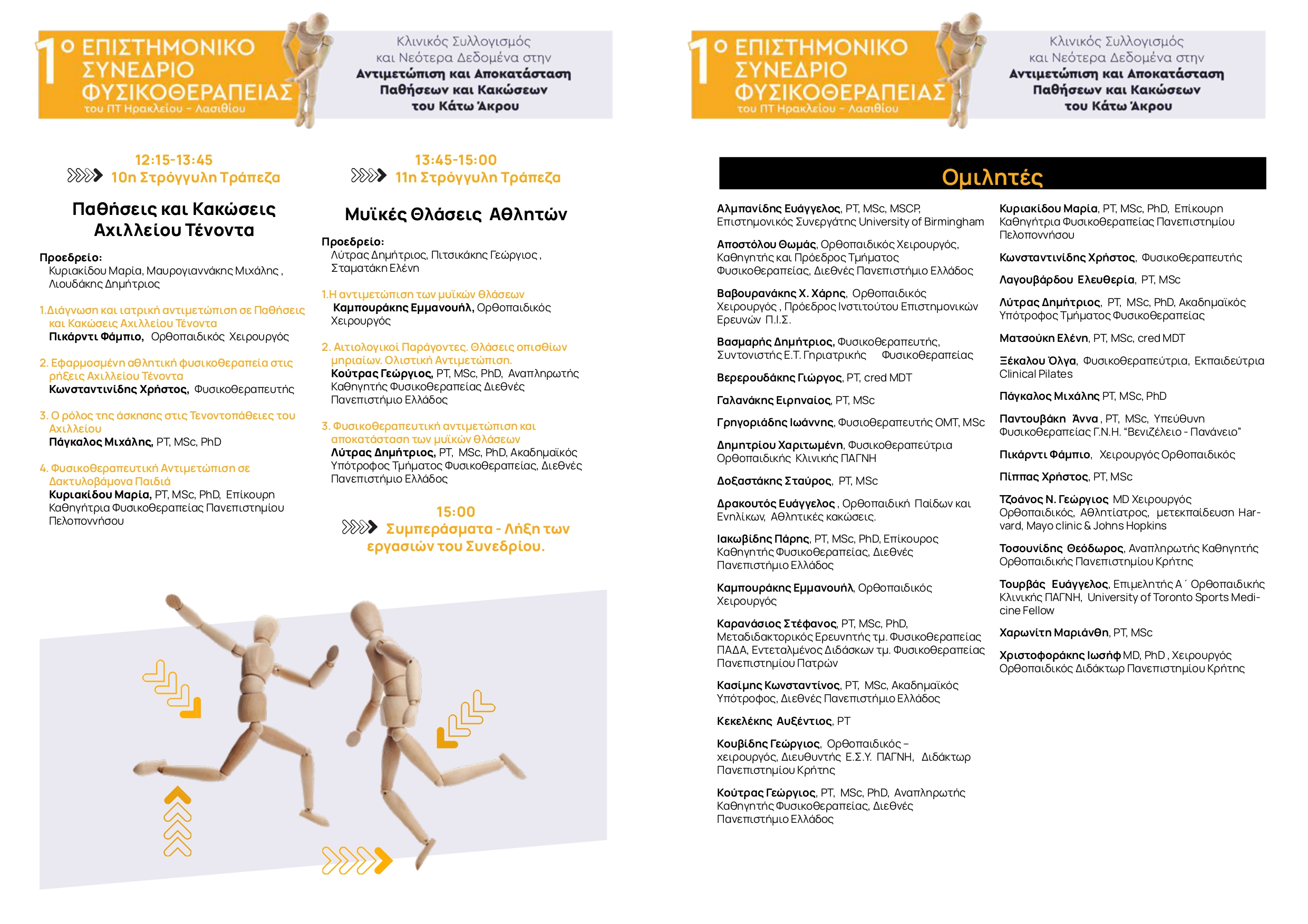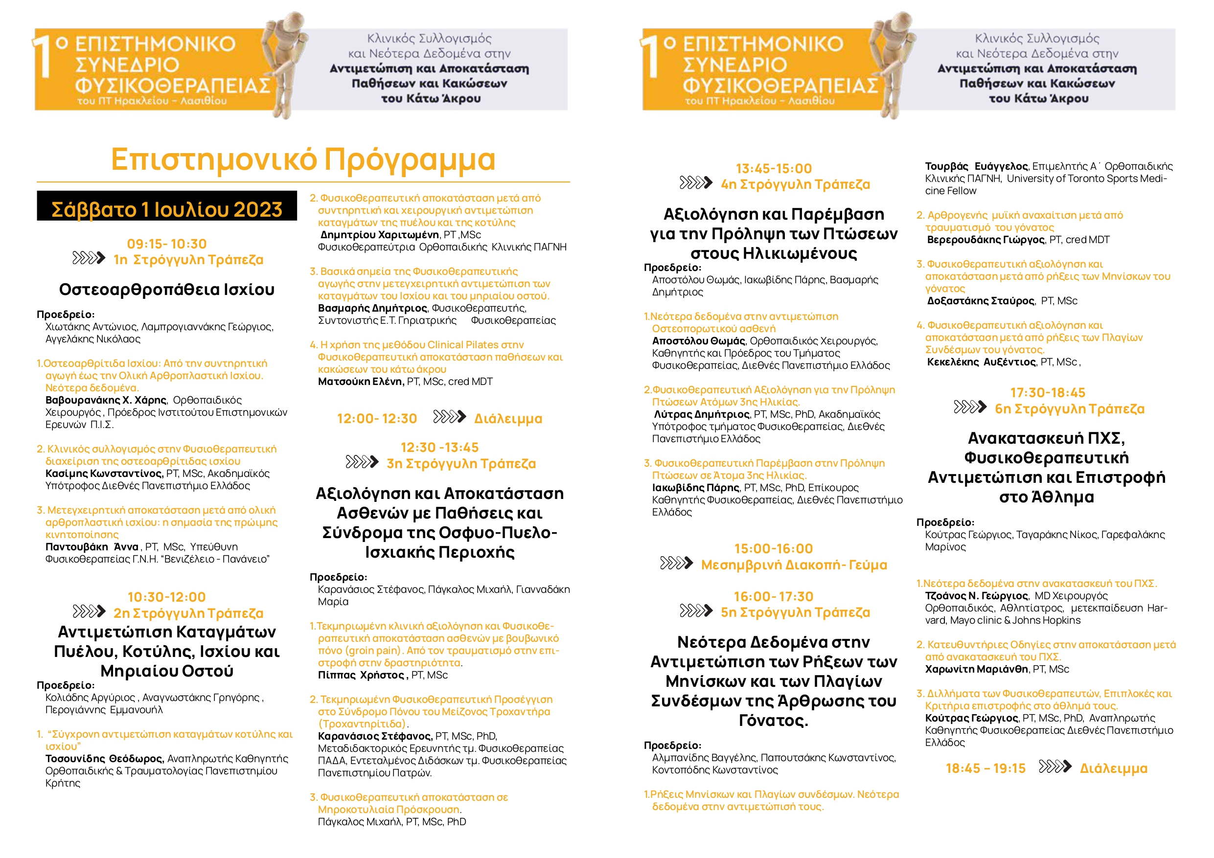To περιφερειακό τμήμα Ηρακλείου – Λασιθίου του Πανελλήνιου Συλλόγου Φυσικοθεραπευτών σε συνεργασία με το Τμήμα Φυσικοθεραπείας της Σχολής Επιστημών Υγείας του Διεθνούς Πανεπιστήμιου της Ελλάδος, και την στήριξη της Περιφέρειας Κρήτης διοργανώνει το 1ο Επιστημονικό Συνέδριο Φυσικοθεραπείας με θέμα «Κλινικός Συλλογισμός και Νεότερα Δεδομένα στην Αντιμετώπιση και Αποκατάσταση Παθήσεων και Κακώσεων του Κάτω Άκρου» που θα πραγματοποιηθεί για πρώτη φορά στο Πολιτιστικό Συνεδριακό Κέντρο Ηρακλείου, αλλά και στην Κρήτη.