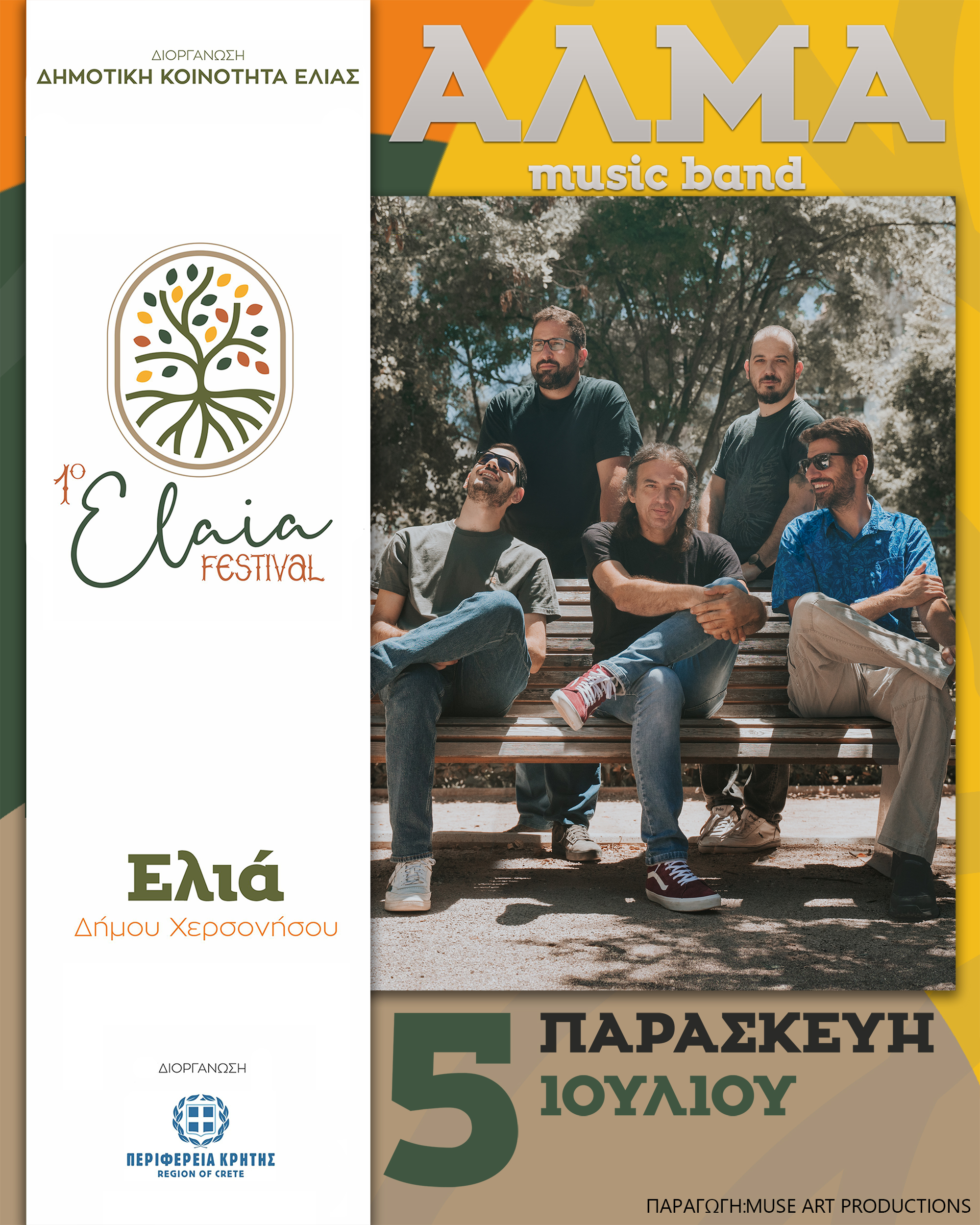 Την Παρασκευή 5 Ιουλίου ο Δημήτρης Χουρδάκης  και οι Alma music band  ανοίγουν την αυλαία του 1ου Φεστιβάλ Ελιάς , στην δημοτική κοινότητα Ελιάς Πεδιάδος  του Δήμου Χερσονήσου.
