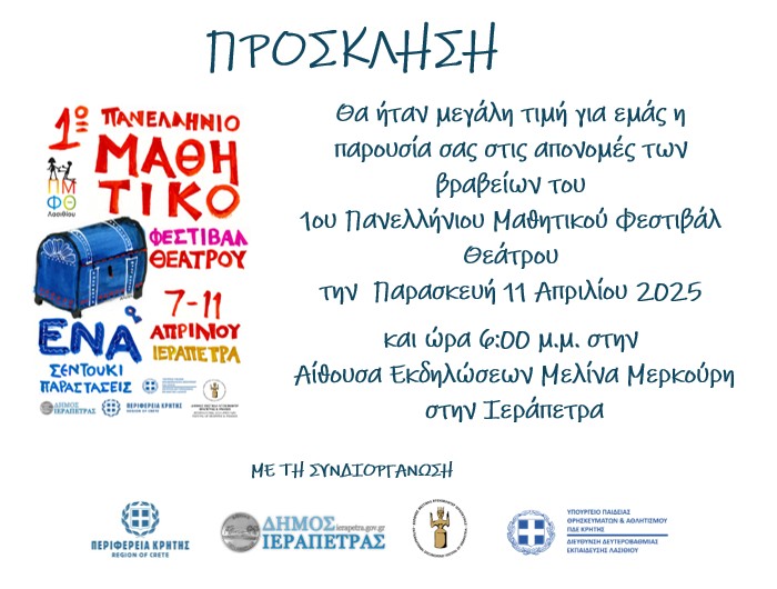 Με καίρια επιδίωξη την ενίσχυση της θεατρικής παιδείας των μαθητ(ρι)ών και την ανάδειξη του Θεάτρου ως μέσου για την πολιτιστική, πολιτική, κοινωνική, ηθικοπνευματική παίδευσή τους και την καλλιέργεια της ενεργούς πολιτειότητας, η Διεύθυνση Δευτεροβάθμιας Εκπαίδευσης Λασιθίου διοργανώνει το 1ο Πανελλήνιο Μαθητικό Φεστιβάλ Θεάτρου, σε συνεργασία με την Περιφέρεια Κρήτης – Περιφερειακή Ενότητα Λασιθίου, τον Δήμο Ιεράπετρας και το Διεθνές Φεστιβάλ Ντοκιμαντέρ Ιεράπετρας & Αwards και με την υποστήριξη και εθελοντική συμμετοχή του Κέντρου Εκπαίδευσης για το Περιβάλλον και την Αειφορία (Κ.Ε.ΠΕ.Α.) Ιεράπετρας-Νεάπολης, του Συλλόγου Φίλων Θεάτρου Ιεράπετρας και των σχολικών κοινοτήτων (εκπαιδευτικών, γονέων και μαθητών).