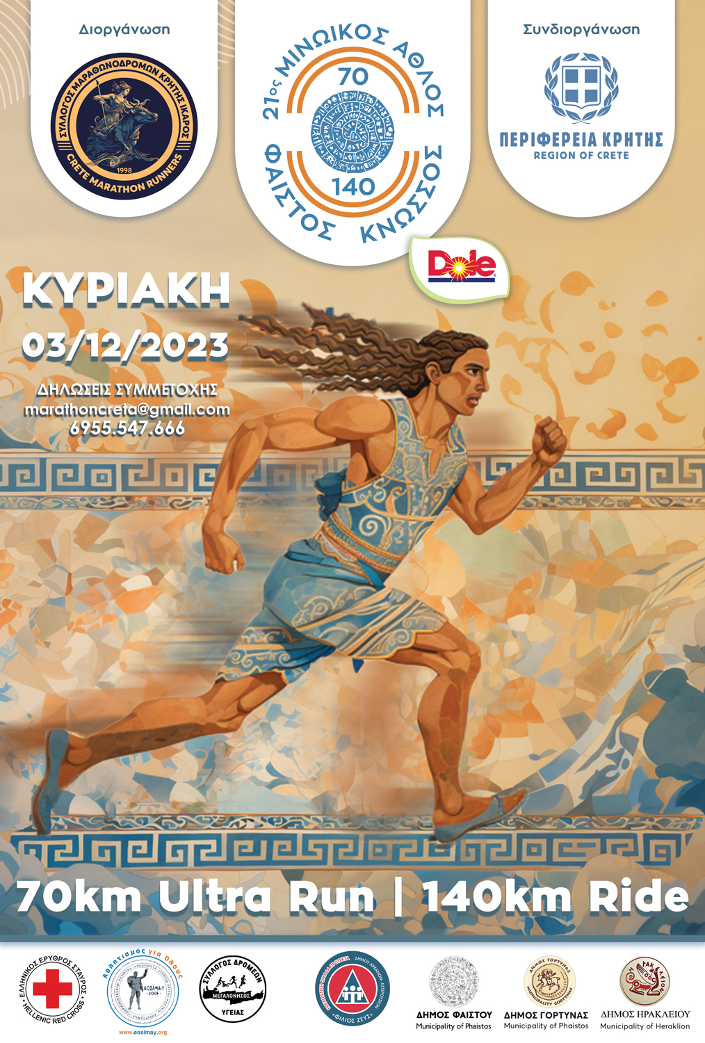 Ο σύλλογος μαραθωνοδρόμων Κρήτης «Ίκαρος» με την υποστήριξη της Περιφέρειας Κρήτης πραγματοποιεί στις 3 Δεκεμβρίου τον 21ο διεθνή αγώνα υπεραπόστασης με την επωνυμία «Μινωικός Άθλος». Ο αγώνας είναι συνολικής απόστασης 70 χλμ με την εκκίνηση να δίδεται στις 8:00 το πρωί από τον αρχαιολογικό χώρο της Φαιστού και ο τερματισμός να πραγματοποιείται στον αρχαιολογικό χώρο της Κνωσσού.
