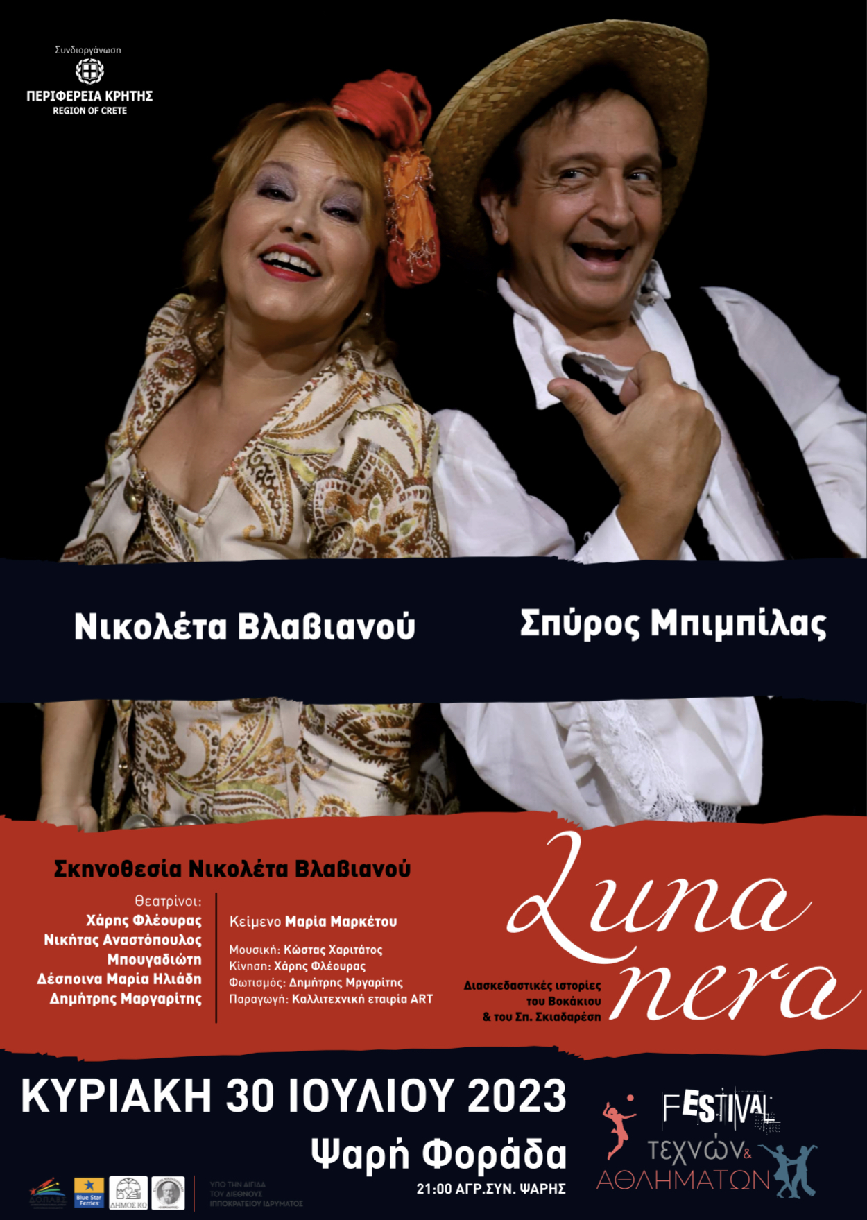 Την Κυριακή 30 Ιουλίου 2023 και ώρα 21.00 στον Αγροτικό Συνεταιρισμό Ψαρής, θα παρουσιαστεί η θεατρική παράσταση «Luna Nera” (μια μακάβρια κωμωδία) με τους : Νικολέτα Βλαβιανού, Σπύρο Μπιμπίλα, Νικήτα Αναστασόπουλο κ.α.),