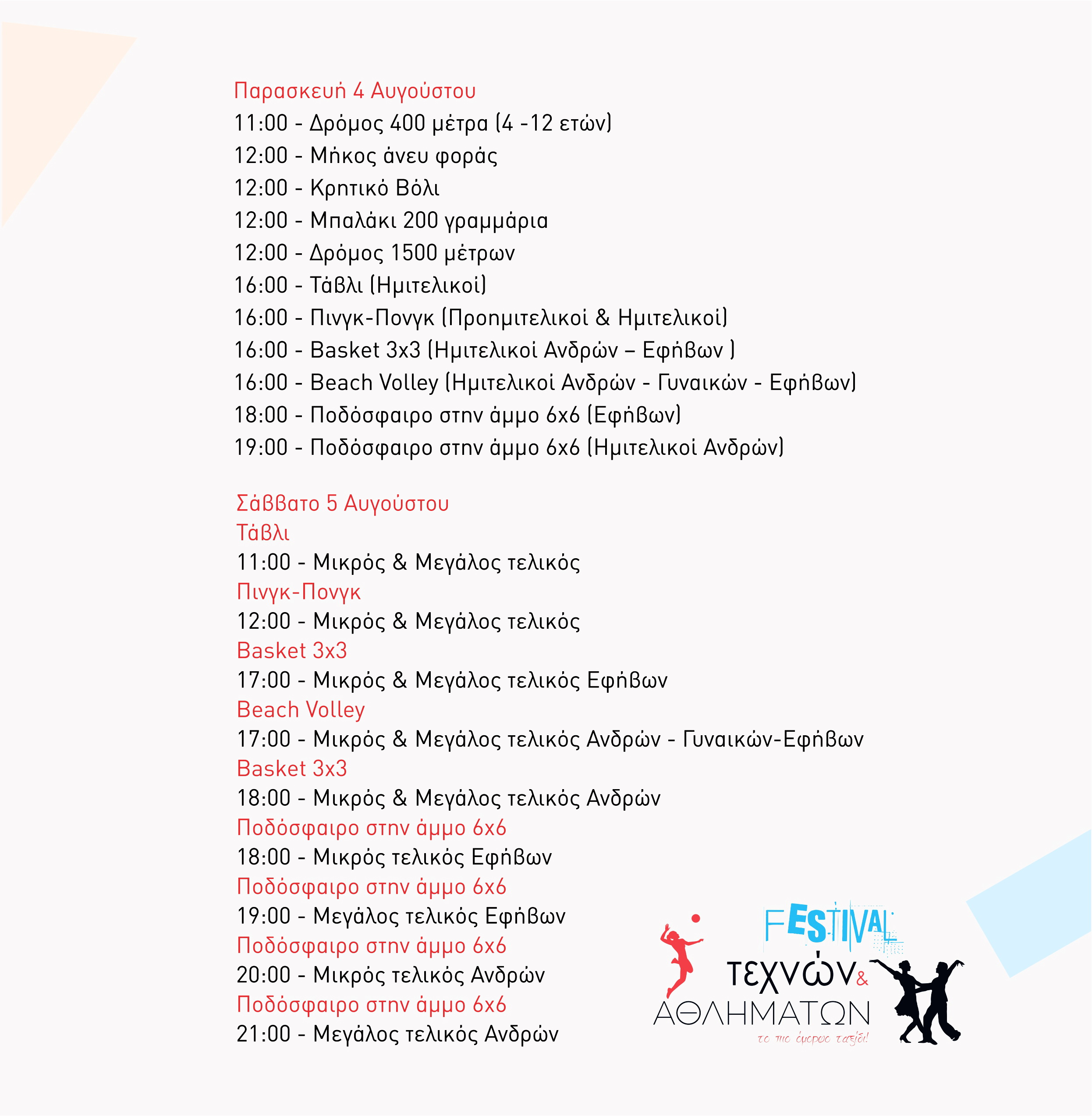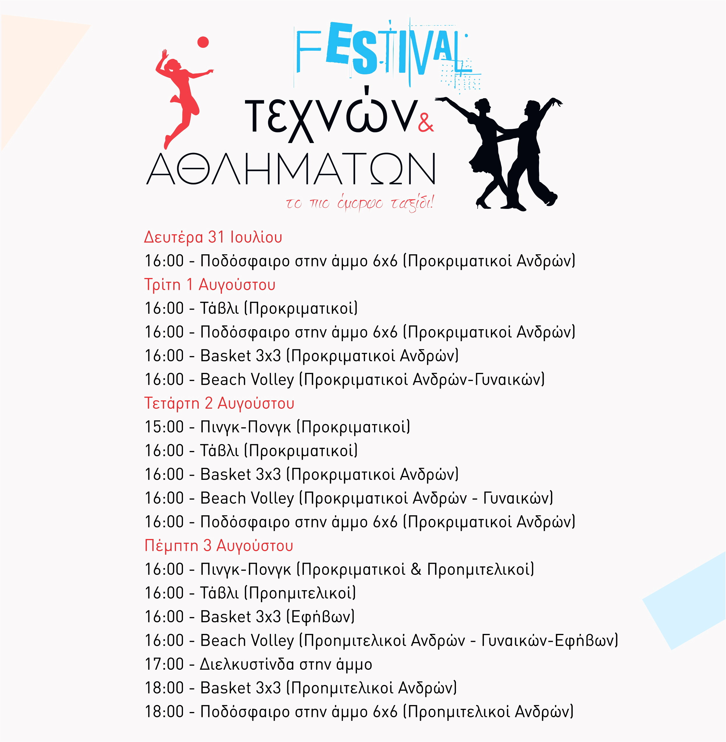Ειδικά για τις αθλητικές εκδηλώσεις που ξεκινούν τη Δευτέρα 31 Ιουλίου, καλούνται οι ερασιτέχνες αθλητές όλων των ηλικιών να πάρουν μέρος στα εξής αθλήματα: