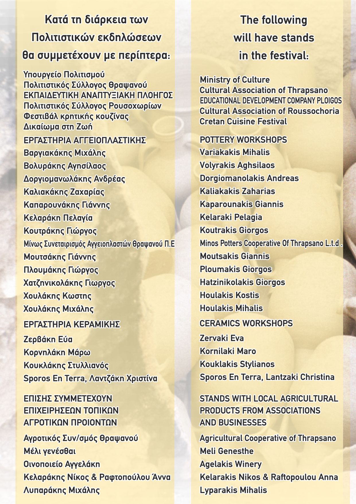 - 00 – 21.00: Ελεύθερα εργαστήρια για παιδιά και ενήλικες στο χώρο εκδήλωσης απο Θραψανιώτες Αγγειοπλάστες