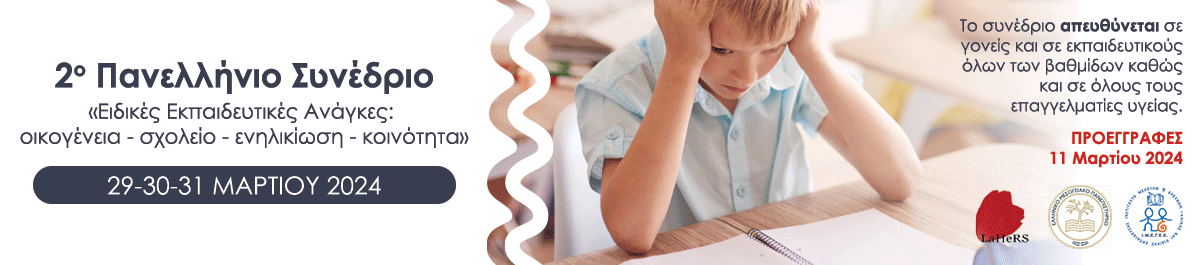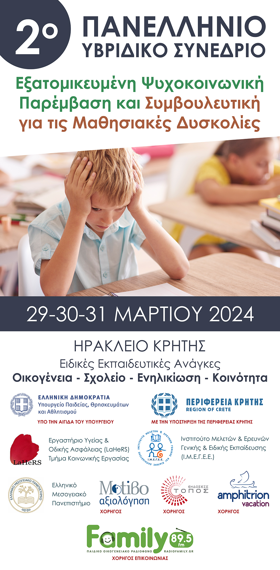 Το 2ο Πανελλήνιο Συνέδριο με θέμα «Ειδικές Εκπαιδευτικές Ανάγκες: οικογένεια- σχολείο – ενηλικίωση – κοινότητα» (https://lahers.hmu.gr/συνεδριο-για-τισ-μαθησιακεσ- δυσκολιε/), θα πραγματοποιηθεί στις 29, 30 & 31 Μαρτίου στο ξενοδοχείο Galaxy στο Ηράκλειο.
