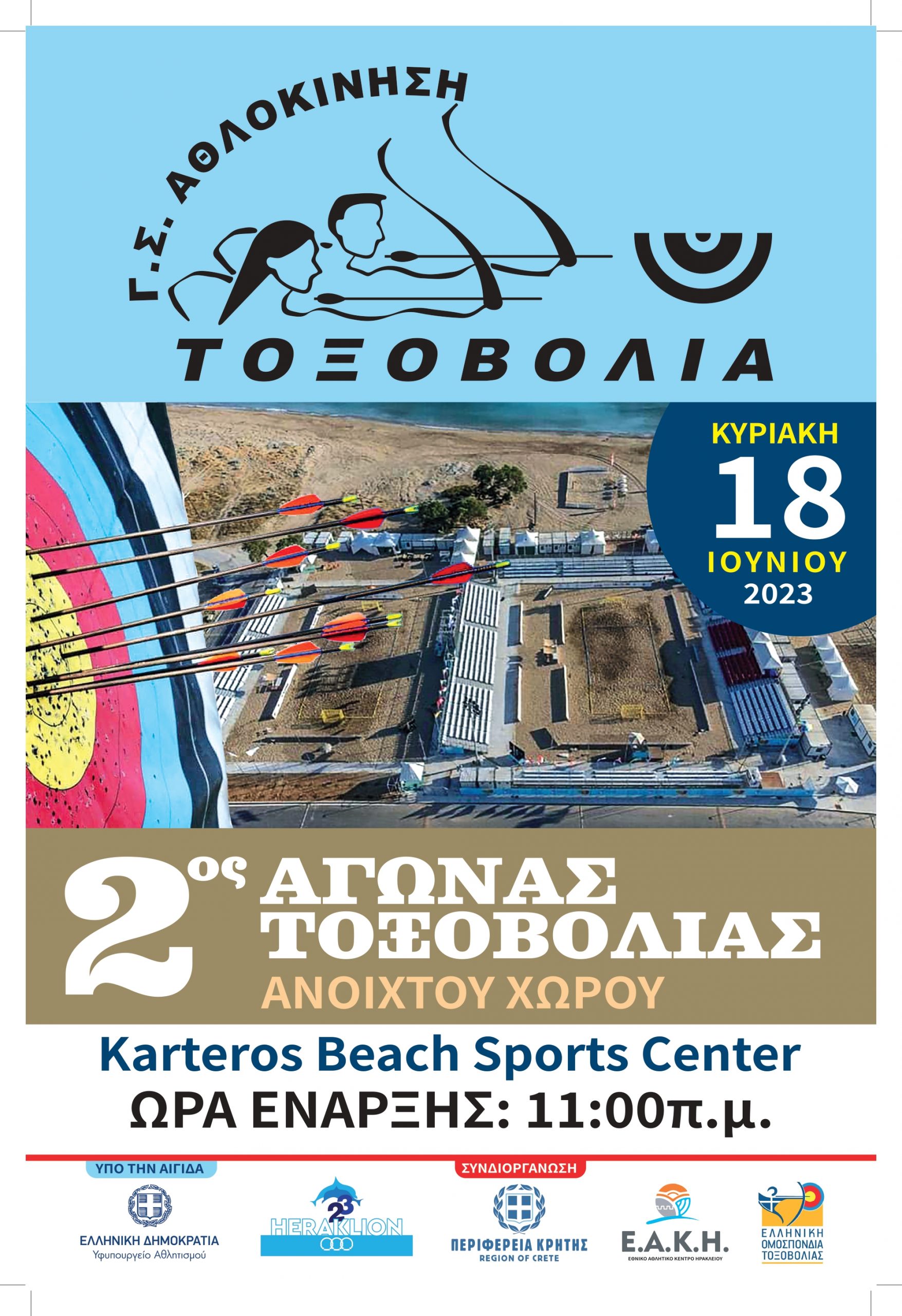 Ο γυμναστικός σύλλογος Αθλοκίνηση, με την υποστήριξη της Ελληνικής Ομοσπονδίας Τοξοβολίας, της Περιφέρειας Κρήτης και του Ε.Α.Κ.Η διοργανώνει τον 2ο αγώνα τοξοβολίας ανοιχτού χώρου. Οι αγώνες που πραγματοποιούνται υπό την αιγίδα του Υφυπουργείου Αθλητισμού και της Οργανωτικής Επιτροπής των 3ων Παράκτιων Μεσογειακών θα διεξαχθούν στις 18 Ιουνίου στις εγκαταστάσεις του «Κarteros Beach Sports Center».