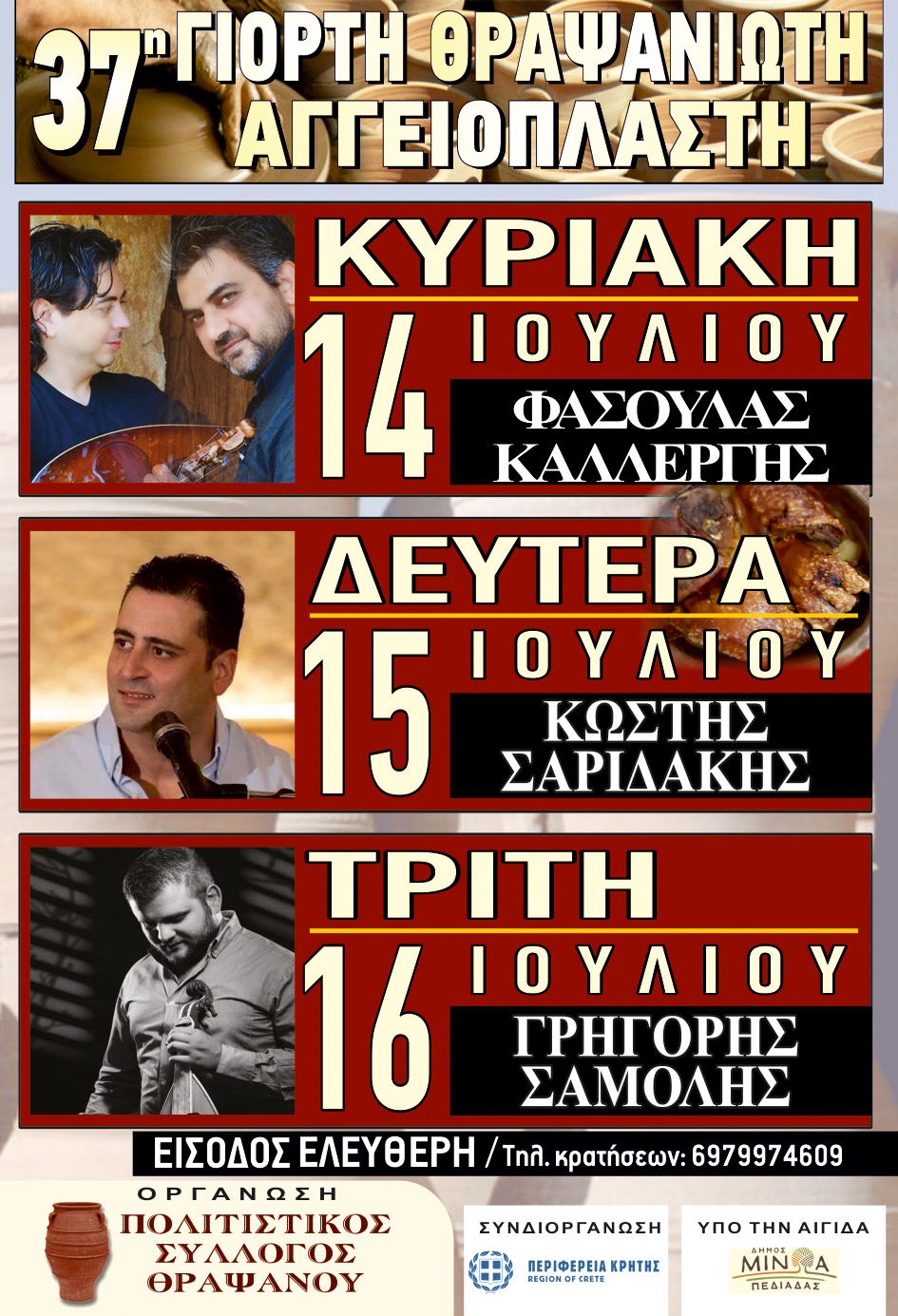 Από τη Κυριακή 14  Ιουλίου αρχίζουν οι 3ήμερες  Κρητικές βραδιές «37η ΓΙΟΡΤΗ ΤΟΥ ΘΡΑΨΑΝΙΩΤΗ ΑΓΓΕΙΟΠΛΑΣΤΗ»   με κρητικούς καλλιτέχνες και κρητικά χορευτικά συγκροτήματα στην κεντρική πλατεία του Θραψανού (από τις 21.00΄ κάθε βράδυ)