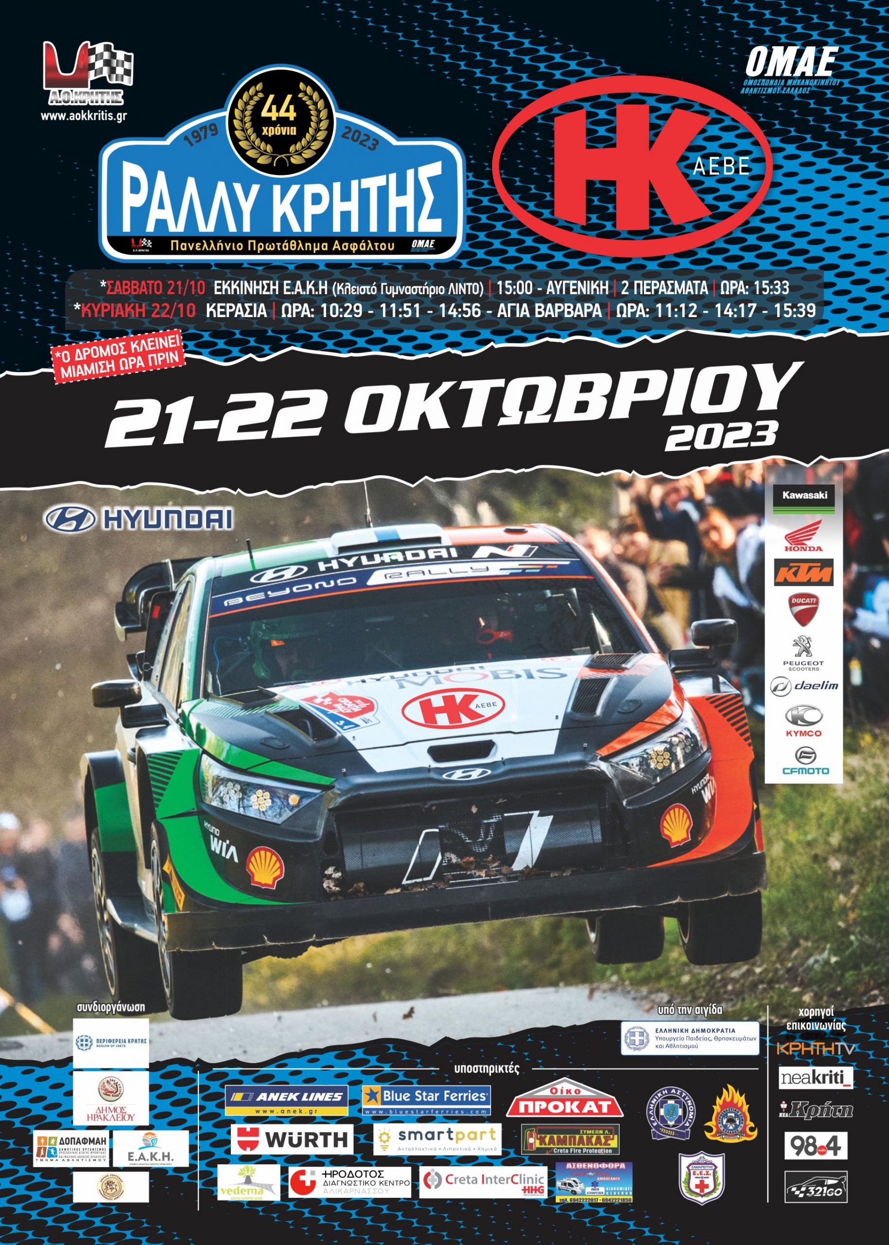 Ο Αθλητικός Όμιλος Κρήτης με την υποστήριξη της Περιφέρεια Κρήτης ,της ΔΟΠΑΦΜΑΗ– Τμήμα Αθλητισμού του Δήμου Ηρακλείου και του Εθνικού Αθλητικού Κέντρου Ηρακλείου πραγματοποιούν στις 21 και 22 Οκτωβρίου το “44ο Ράλλυ Κρήτης”.