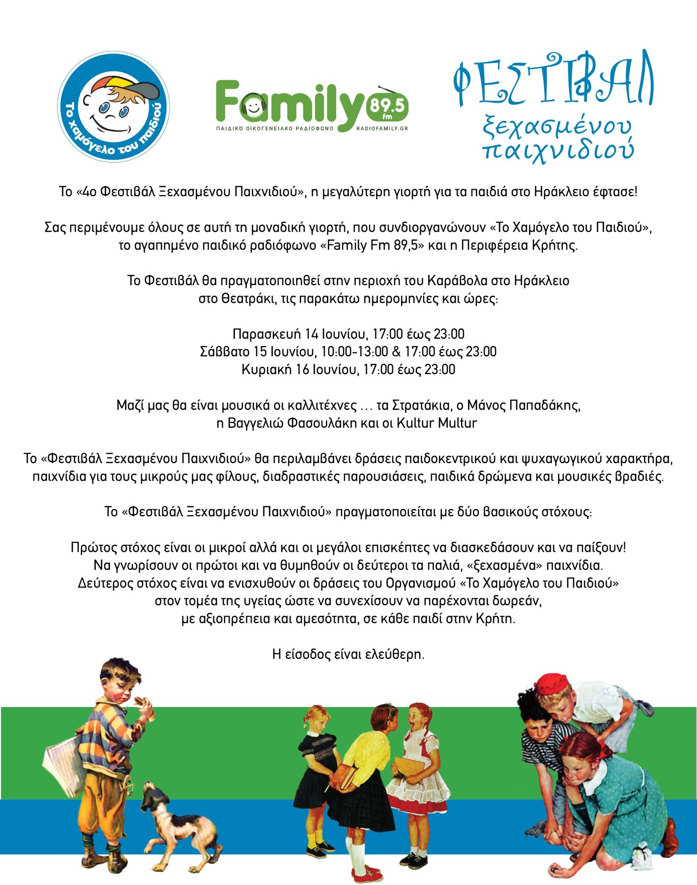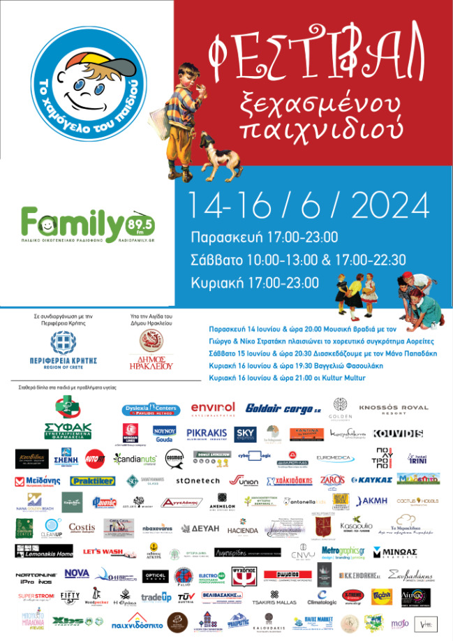 «Το Χαμόγελο του Παιδιού» και το «Παιδικό Ραδιόφωνο Family fm 89.5» σας προσκαλούν στο 4ο Φεστιβάλ Ξεχασμένου Παιχνιδιού που θα πραγματοποιηθεί την Παρασκευή 14 Ιουνίου 17:00μ.μ.-23:00μ.μ., το Σάββατο 15 Ιουνίου και ώρες 10:00π.μ.-13:00μ.μ. και 17:00μ.μ.-22:30μ.μ. και την Κυριακή 17 Ιουνίου, 17:00μ.μ.-23:00μ.μ., με δωρεάν είσοδο, στον Καράβολα Ηρακλείου, στο θεατράκι. Το φεστιβάλ πραγματοποιείται με την στήριξη της Περιφέρειας Κρήτης.