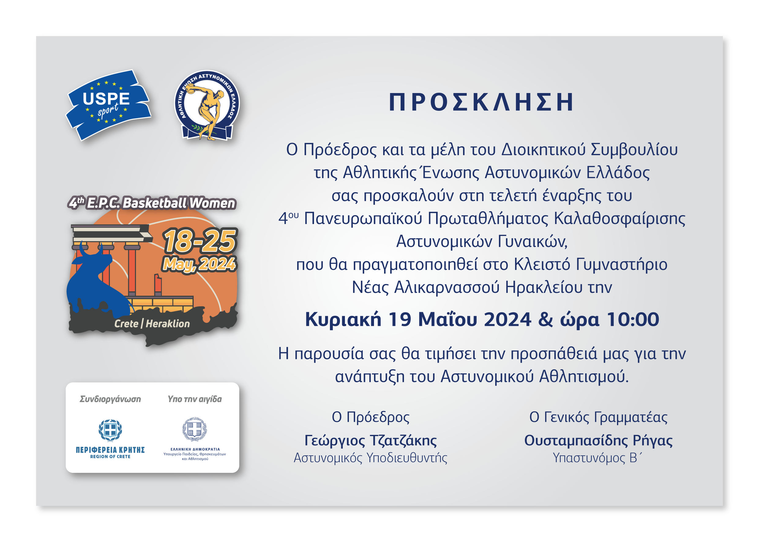 Η Ένωσή ανέλαβε τη διοργάνωση του 4ου Πανευρωπαϊκό Πρωταθλήματος Καλαθοσφαίρισης Αστυνομικών Γυναικών κατά το χρονικό διάστημα, 18-25 Μαΐου 2024. Ο τόπος τέλεσης του πρωταθλήματος θα είναι το Ηράκλειο Κρήτης και το κλειστό Γυμναστήριο Νέας Αλικαρνασσού καθόσον πληροί τις απαιτήσεις της Ευρωπαϊκής Αθλητικής Ένωσης Αστυνομιών (U.S.P.E.) και της Διεθνούς Ομοσπονδίας καλαθοσφαίρισης (F.I.B.A.).
