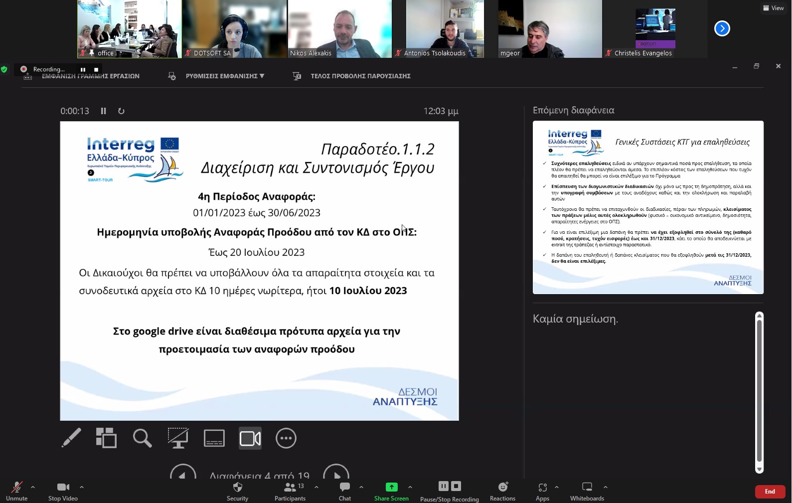 Στη συνέχεια παρουσιάστηκε η πορεία υλοποίησης των παραδοτέων που αφορούν τον Δικαιούχο ΓΓΑΙΝΠ, με το ποσοστό υλοποίησης και πιστοποίησης δαπανών των παραδοτέων να κυμαίνεται στο 85-90%. Ο κ. Αντώνιος Τσολακούδης, Σύμβουλος του έργου παρουσίασε τα στοιχεία των υλοποιημένων δράσεων φυσικού/οικονομικού αντικειμένου και τα επόμενα βήματα υλοποίησης ενώ ενημέρωσε τους συμμετέχοντες της συνάντησης ότι βρίσκονται στο τελικό στάδιο υλοποίησης με μοναδική εκκρεμότητα την οργάνωση της επόμενης Τεχνικής Συνάντησης και της Ημερίδας/Συνεδρίου για τη Διάδοση των Αποτελεσμάτων του έργου, στη Μυτιλήνη, με πιθανή ημερομηνία διεξαγωγής, τον Ιούνιο του 2023. Τέλος, από εκπρόσωπο της εταιρείας nextcom|group (εξωτερικός συνεργάτης της ΓΓΑΙΝΠ), παρουσιάστηκαν η ψηφιακή πλατφόρμα και οι εφαρμογές έχουν αναπτυχθεί στο πλαίσιο της Πράξης.