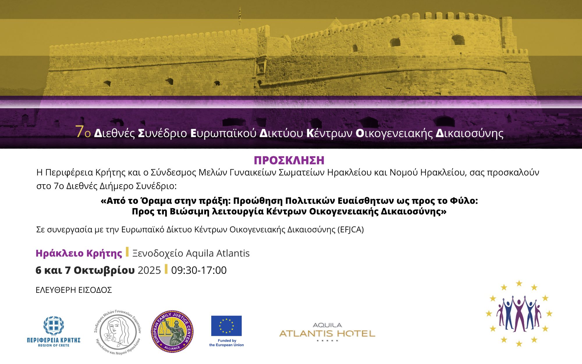 Η Περιφέρεια Κρήτης και ο Σύνδεσμος Μελών Γυναικείων Σωματείων Ηρακλείου και Νομού Ηρακλείου διοργανώνουν το 7ο Διεθνές Διήμερο Συνέδριο, με τίτλο: «Από το Όραμα στην πράξη: Προώθηση Πολιτικών Ευαίσθητων ως προς το Φύλο: Προς τη Βιώσιμη λειτουργία των Κέντρων Οικογενειακής Δικαιοσύνης», σε συνεργασία με το Ευρωπαϊκό Δίκτυο Κέντρων Οικογενειακής Δικαιοσύνης (EFJCA), στο Ηράκλειο, Δευτέρα 6 και Τρίτη 7 Οκτωβρίου 2025, 9:30π.μ.-5:00μ.μ. στο ξενοδοχείο «Aquila Atlantis», με ελεύθερη είσοδο για το κοινό.