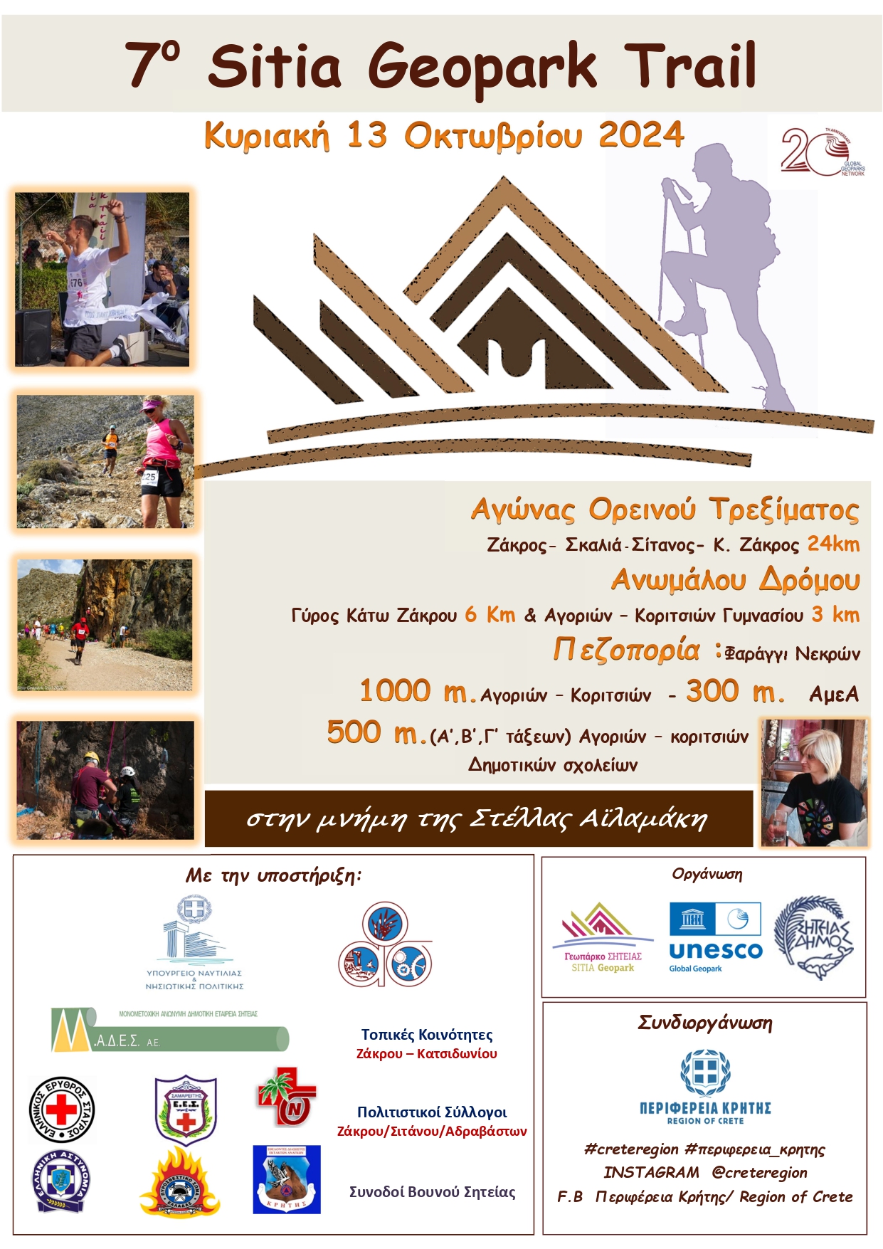 Την Κυριακή 13 Οκτωβρίου 2024 θα διεξαχθούν οι αγώνες «7ο SITIA GEOPARK TRAIL» (ορεινού τρεξίματος, ανωμάλου δρόμου, πεζοπορίας), με την οργάνωση του Παγκόσμιου Γεωπάρκου UNESCO της Σητείας και του Δήμου Σητείας , τη συνδιοργάνωση της Περιφέρειας Κρήτης και την υποστήριξη του Υπουργείου Ναυτιλίας & νησιωτικής πολιτικής, Μ.Α.Δ.Ε. Α.Ε. , Ο.Α.Σ., των τοπικών κοινοτήτων Ζάκρου – Κατσιδωνίου, πολιτιστικών συλλόγων Ζάκρου – Σιτάνου – Αδραβάστων, Ε.Ε.Σ., ΕΔΕΑΚ, Αστυνομία, Π/Υ, Νοσοκομείο, Συνοδοί βουνού.
