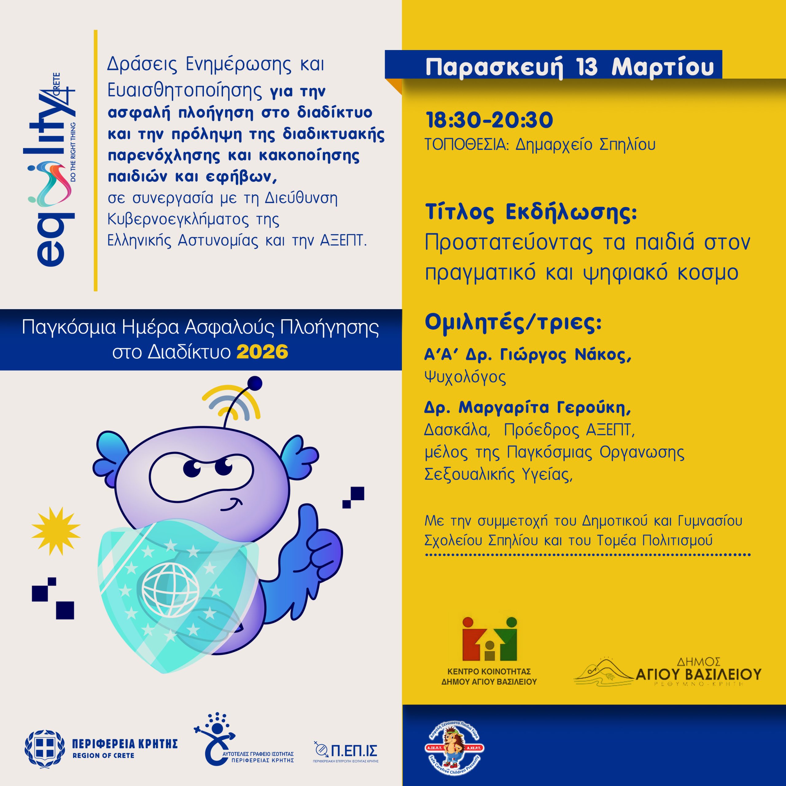 Επίσης, την Παρασκευή, 13 Μαρτίου 2026 θα πραγματοποιηθεί ανοιχτή ενημερωτική δράση για το κοινό, 18:30-20:30, στο Δημαρχείο Σπηλίου, με τίτλο: «Προστατεύοντας τα παιδιά στον πραγματικό και ψηφιακό κόσμο», σε συνδιοργάνωση με τον Δήμο Αγίου Βασιλείου, το Κέντρο Κοινότητας Δήμου Αγίου Βασιλείου και με τη συμμετοχή του Δημοτικού και Γυμνασίου Σχολείου Σπηλίου.