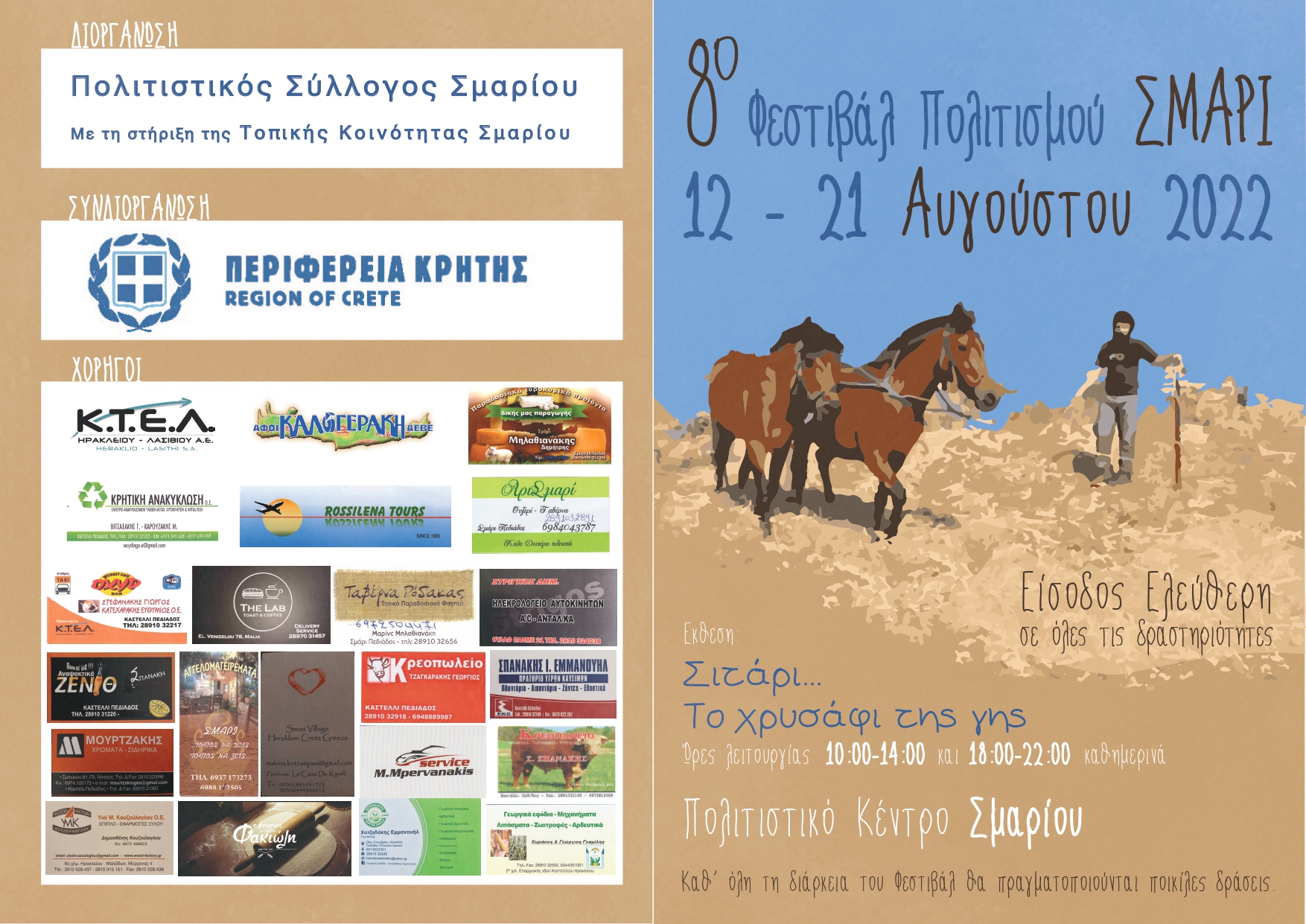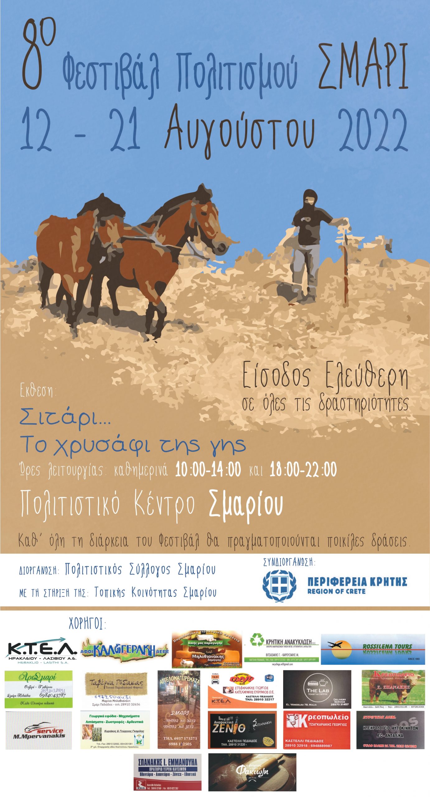 Ο Πολιτιστικός Σύλλογος Σμαρίου διοργανώνει το «8ο ΦΕΣΤΙΒΑΛ ΠΟΛΙΤΙΣΜΟΥ» που θα πραγματοποιηθεί από την Παρασκευή 12 έως την Κυριακή 21 Αυγούστου 2022, σε συνδιοργάνωση με την Περιφέρεια Κρήτης και τη στήριξη της Τοπικής Κοινότητας Σμαρίου.