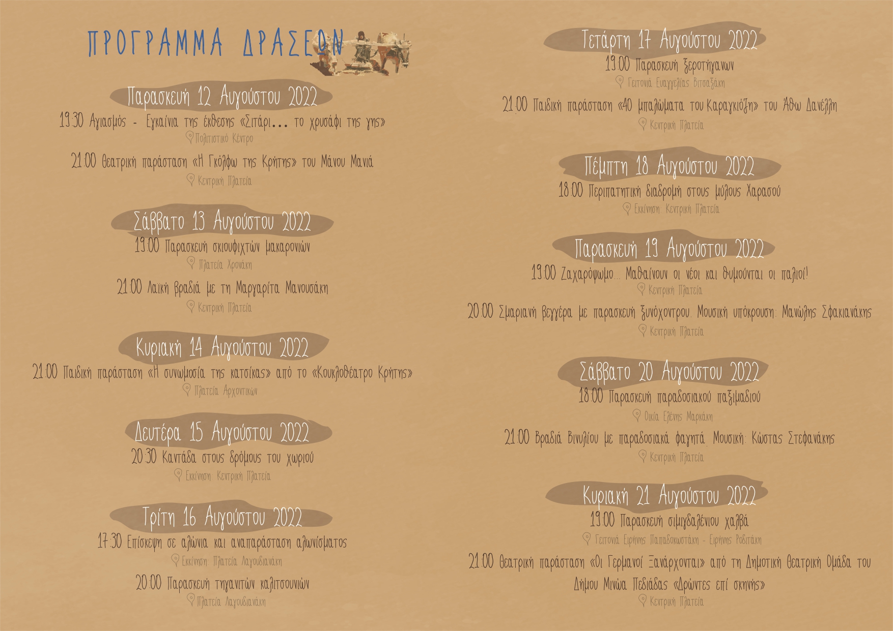 21:00 Θεατρική παράσταση «Οι Γερμανοί Ξανάρχονται» από τη Δημοτική Θεατρική Ομάδα του Δήμου Μινώα Πεδιάδας «Δρώντες επί σκηνής»