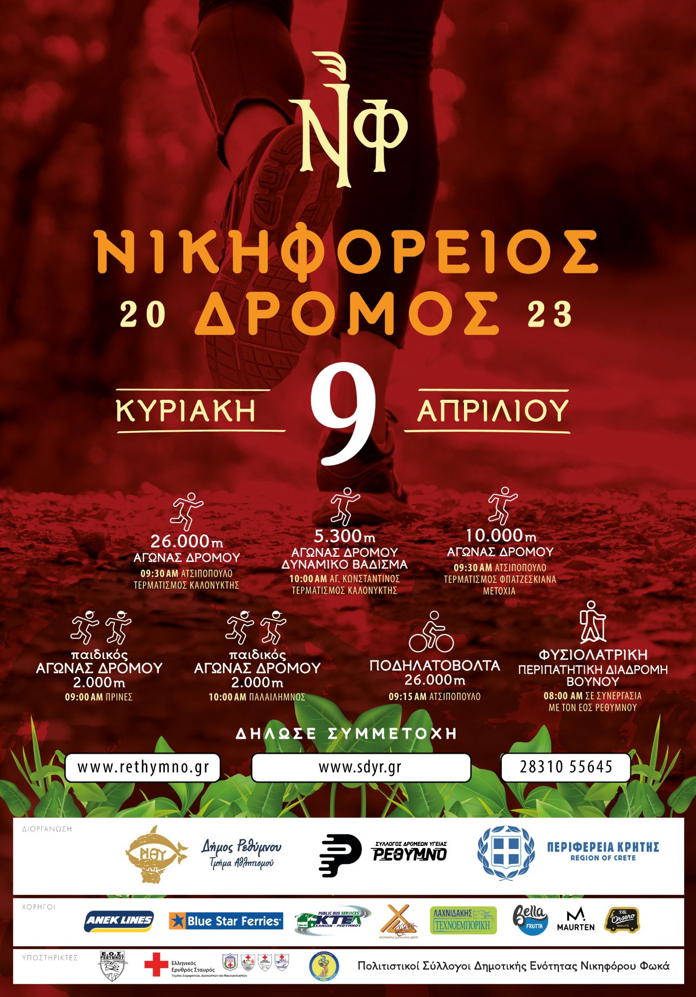 Ο Δήμος Ρεθύμνου με την υποστήριξη της Περιφέρειας Κρήτης πραγματοποιεί τον «8ο Νικηφόρειο Δρόμο». Η διοργάνωση θα πραγματοποιεί την Κυριακή 9 Απριλίου 2023 και υλοποιείται με τη βοήθεια του Συλλόγου Δρομέων Υγείας Ρεθύμνου με τη συνεργασία των πολιτιστικών συλλογών της Δημοτικής Ενότητας Νικηφόρου Φωκά καθώς και τον ΕΟΣ Ρεθύμνου.