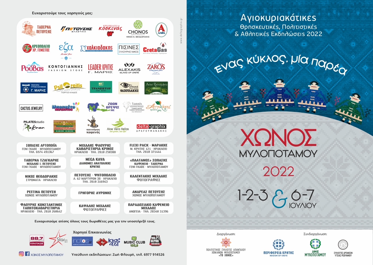 Οι φετινές εκδηλώσεις στην ορεινή γωνιά του Μυλοποτάμου ανοίγουν με δυο αδέλφια, που η φήμη τους έχει ξεπεράσει την Κρήτη. Ο Γιώργος και ο Νίκος Στρατάκης και το συγκρότημα τους έρχονται την Παρασκευή 1 Ιουλίου, στο Χώνος Μυλοποτάμου γνωρίζοντας πολύ καλά ότι η κρητική, η παραδοσιακή μας μουσική είναι ένα δημιουργικό ταξίδι ήχων, λέξεων και συναισθημάτων. Στην χοροεσπερίδα, που η είσοδος είναι ελεύθερη και πραγματοποιείται στον προαύλιο χώρο του Δημοτικού Σχολείου, θα χορέψει και ο Κρητικός Χορευτικός Σύλλογος «Τ’ αόρι» του Στέλιου Πατελάρου και της Κατερίνας Ανδρεαδάκη.