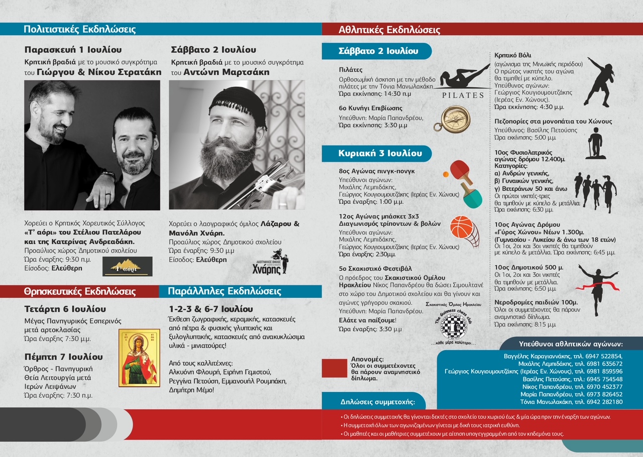 Οι φετινές εκδηλώσεις στην ορεινή γωνιά του Μυλοποτάμου ανοίγουν με δυο αδέλφια, που η φήμη τους έχει ξεπεράσει την Κρήτη. Ο Γιώργος και ο Νίκος Στρατάκης και το συγκρότημα τους έρχονται την Παρασκευή 1 Ιουλίου, στο Χώνος Μυλοποτάμου γνωρίζοντας πολύ καλά ότι η κρητική, η  παραδοσιακή μας  μουσική είναι ένα δημιουργικό ταξίδι ήχων, λέξεων και συναισθημάτων. Στην χοροεσπερίδα, που η είσοδος είναι ελεύθερη και πραγματοποιείται στον προαύλιο χώρο του Δημοτικού Σχολείου, θα χορέψει και ο Κρητικός Χορευτικός Σύλλογος «Τ’ αόρι» του Στέλιου Πατελάρου και της Κατερίνας Ανδρεαδάκη.