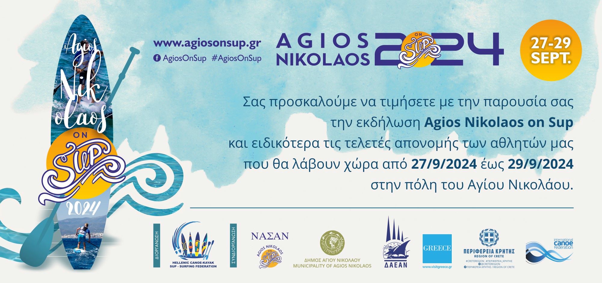 Η Παγκόσμια Ομοσπονδία Κάνοε (ICF), η Ελληνική Ομοσπονδία Κάνοε-Καγιάκ, Όρθιας Σανιδοκωπηλασίας, Κυματολίσθησης με Σανίδα με τη στήριξη της Περιφέρειας Κρήτης, σε συνεργασία με τον Δήμο Αγίου Νικολάου και το Ναυτικό Αθλητικό Σύλλογο Αγίου Νικολάου, διοργανώνουν για ακόμη μια χρονιά το Παγκόσμιο Κύπελλο SUP-ICF World Ranking στις 27-29 Σεπτεμβρίου 2024 στον Άγιο Νικόλαο.