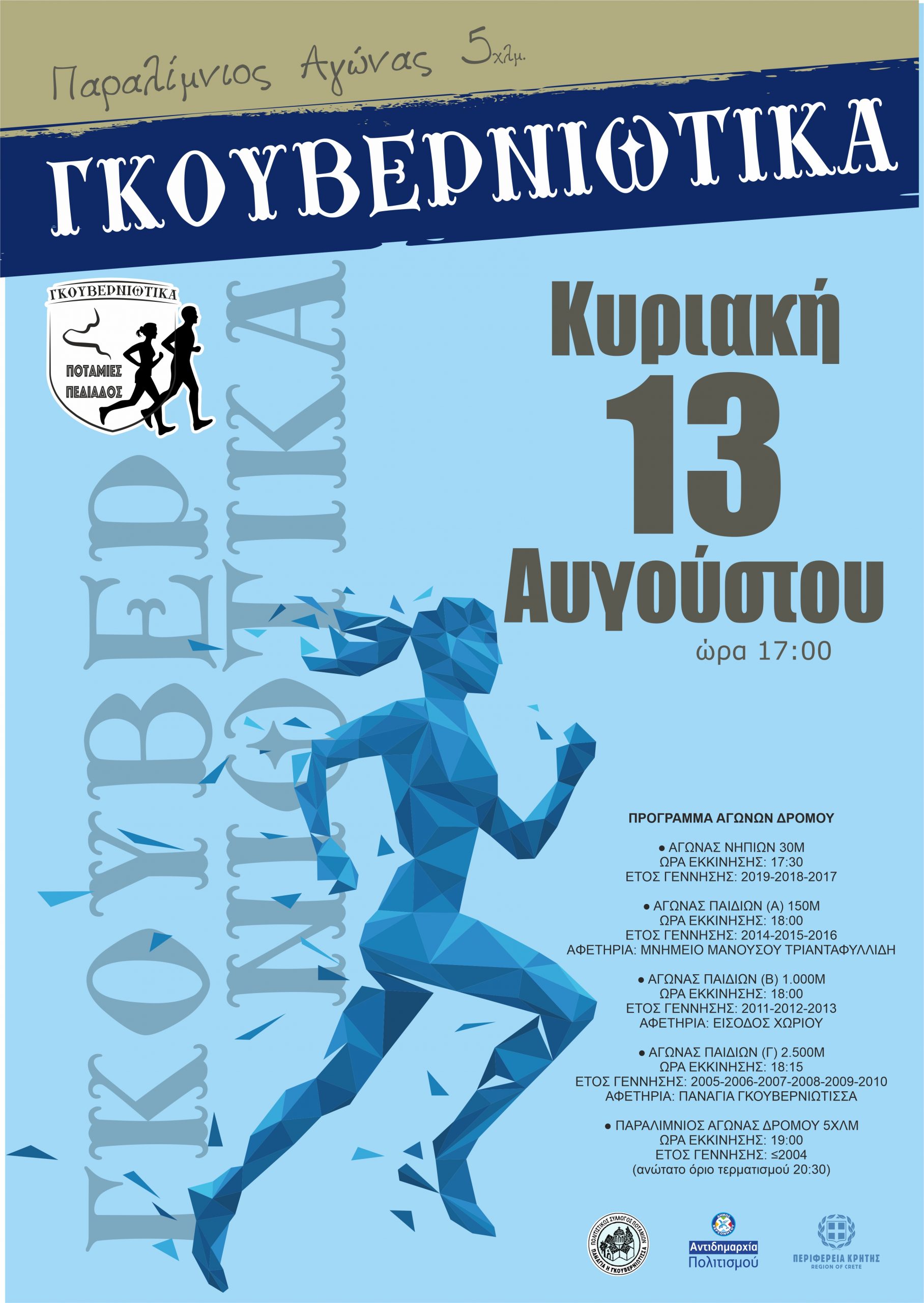 • Στον αγώνα δρόμου των παίδων (Γ) συνολικής διαδρομής 2.500μ., μπορούν να δηλώσουν συμμετοχή τα παιδιά που έχουν γεννηθεί το 2005-2006-2007-2008-2009-2010. Η εκκίνηση θα δοθεί στις 18:15 από τη Παναγία Γκουβερνιώτισσα