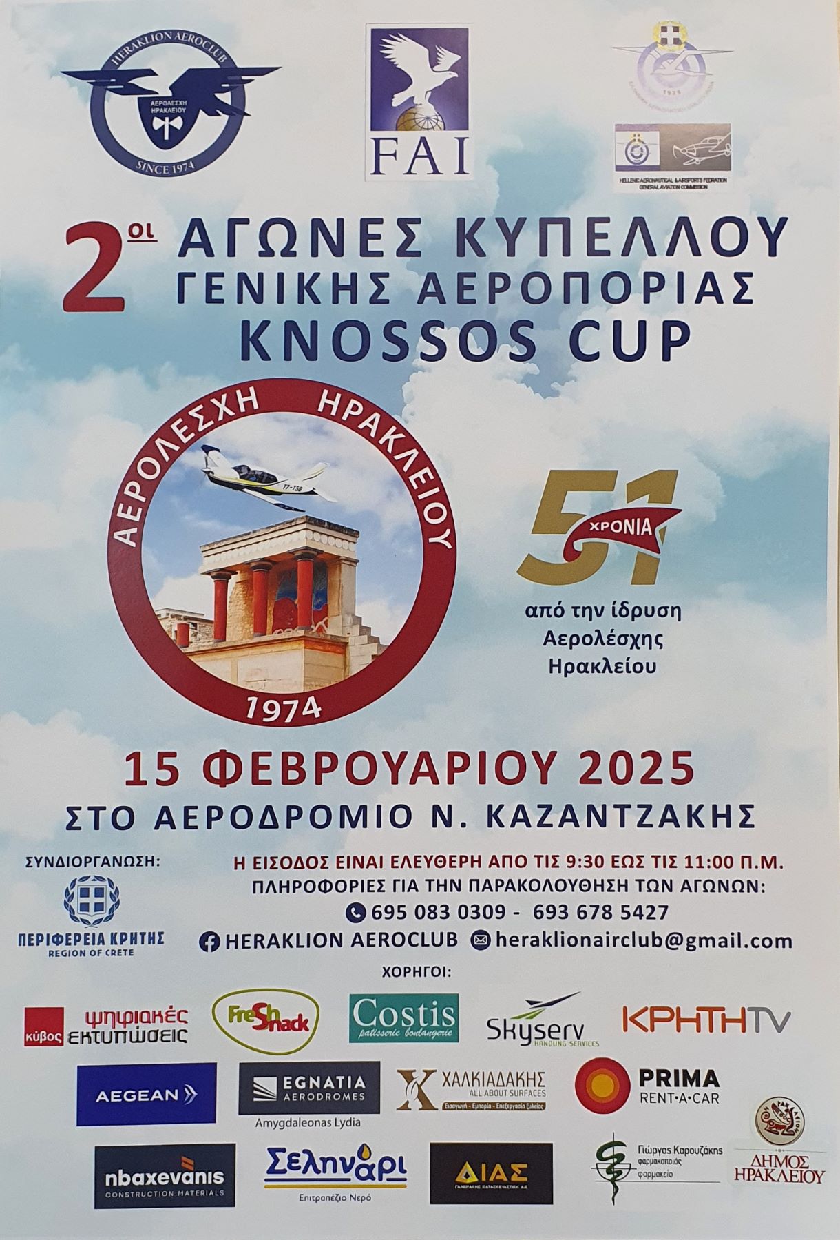 Η Αερολέσχη Ηρακλείου, σε συνδιοργάνωση με την Περιφέρεια Κρήτης, διοργανώνει τους αγώνες γενικής αεροπορίας με τίτλο «2o KNOSSOS CUP», που θα διεξαχθούν στο Αεροδρόμιο Ηρακλείου «Νίκος Καζαντζάκης». Στους αγώνες θα συμμετάσχουν 22 πληρώματα από όλη την Ελλάδα, τα οποία θα ανταγωνιστούν με ελαφρά μονοκινητήρια αεροσκάφη, επιδεικνύοντας υψηλά πρότυπα αεροπορικής ικανότητας και τεχνογνωσίας.