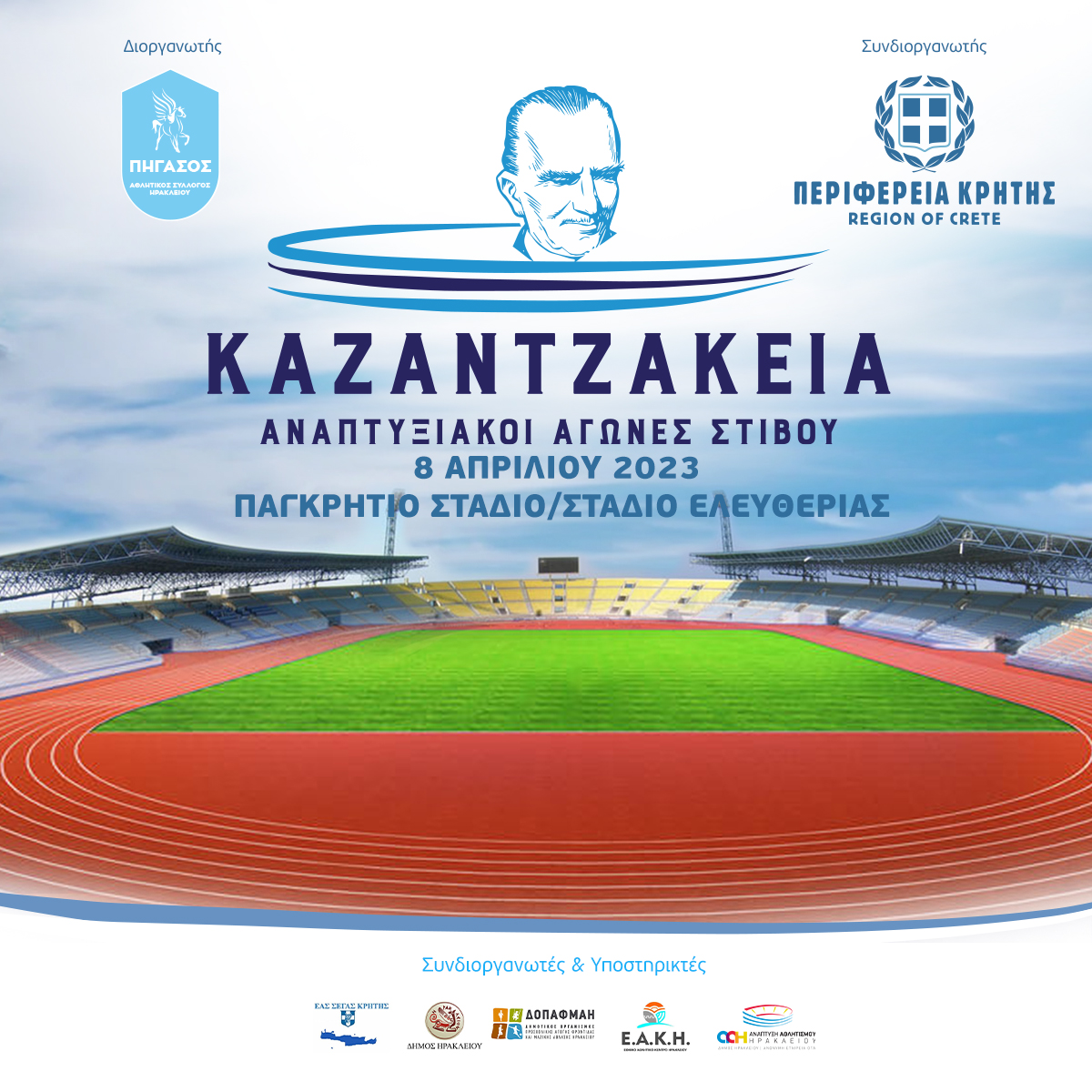 Ο Α.Π.Σ. Πήγασος Ηρακλείου και η ΕΑΣ ΣΕΓΑΣ ΚΡΗΤΗΣ, με τη συνδιοργάνωση της Περιφέρειας Κρήτης, του Δήμου Ηρακλείου, του Δ.Ο.Π.Α.Φ.Μ.Α.Η, της «Ανάπτυξης Αθλητισμού Ηρακλείου ΑΕ ΟΤΑ» και του Εθνικού Αθλητικού Κέντρου Ηρακλείου, διοργανώνουν τους Αναπτυξιακούς αγώνες στίβου «ΚΑΖΑΝΤΖΑΚΕΙΑ 2023».