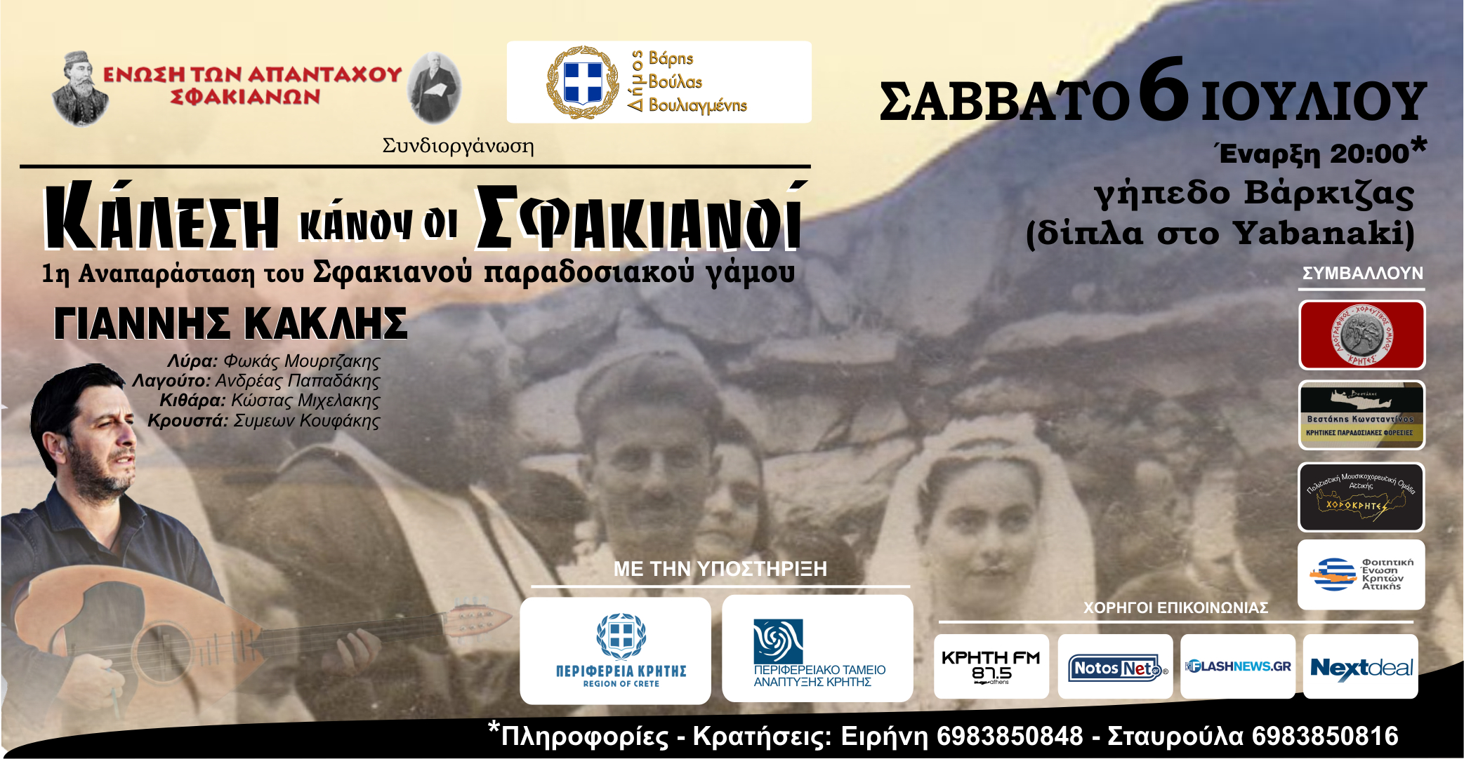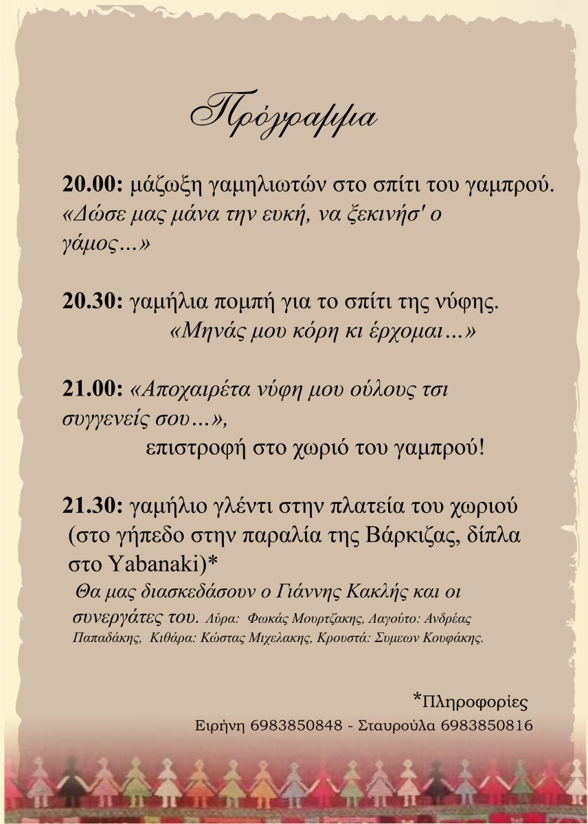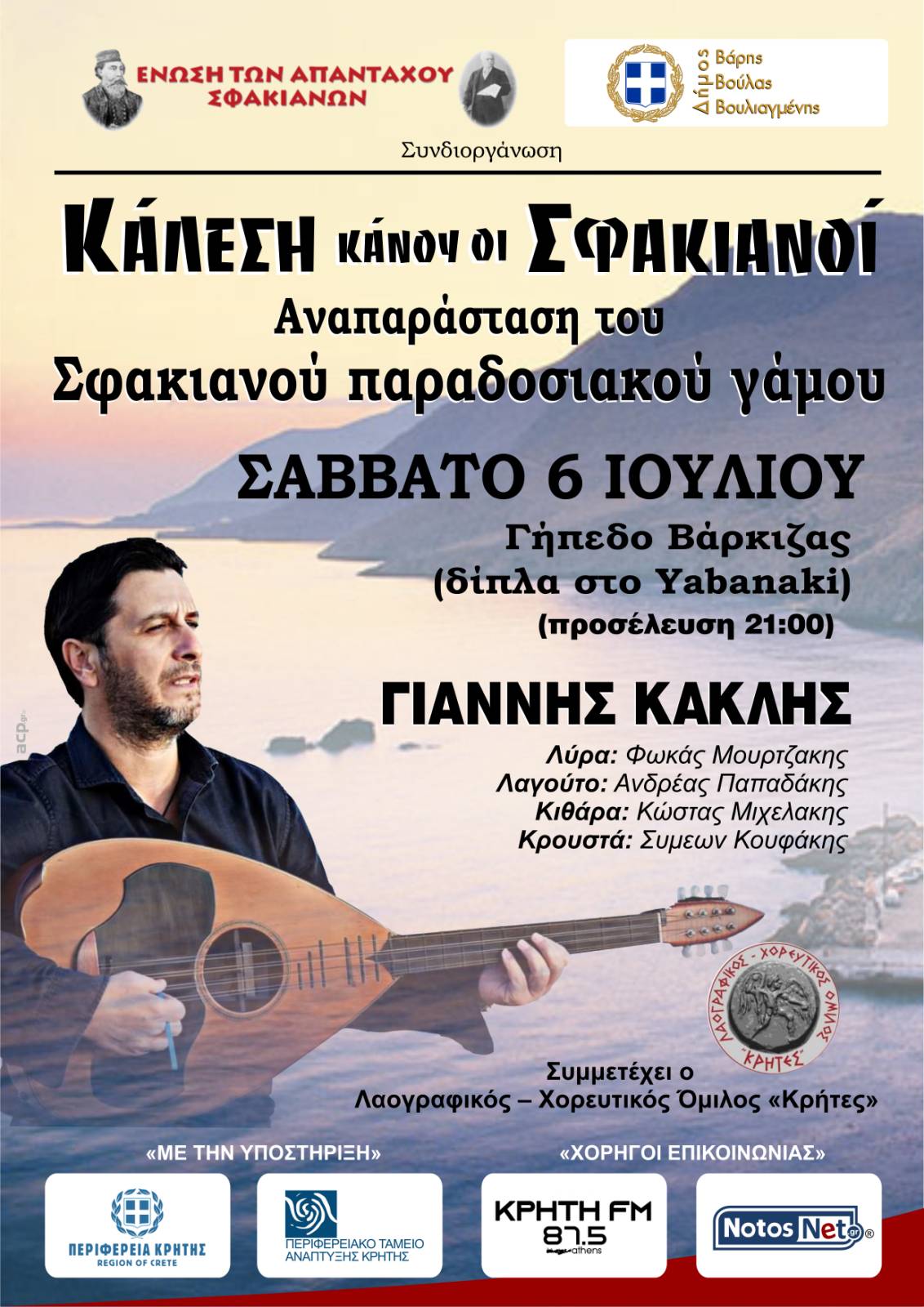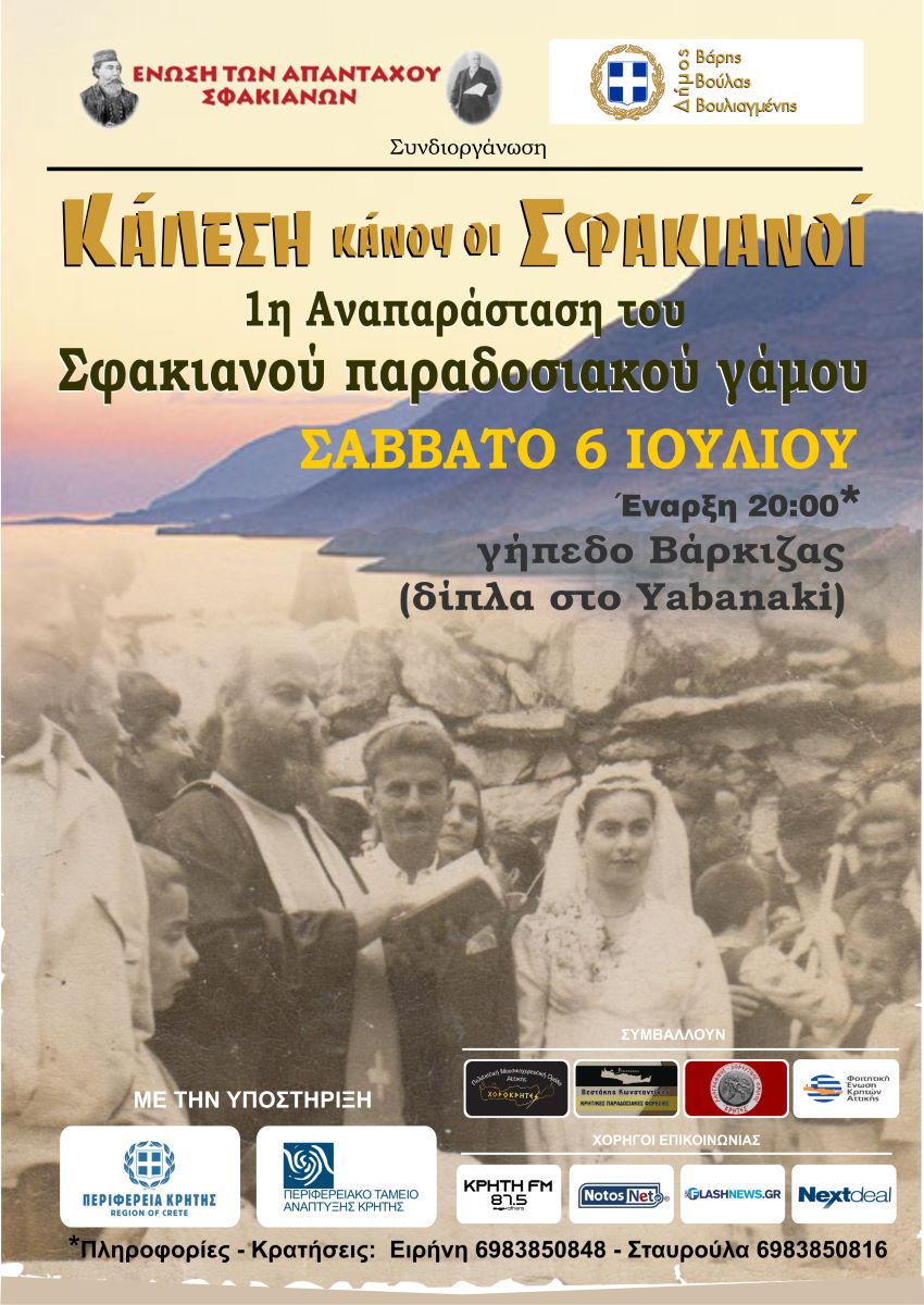 Ο φιλόξενος Δήμος Βάρης Βούλας Βουλιαγμένης μοιράστηκε τις ευαισθησίες μας κι έτσι συνδιοργανώνουμε, με την στήριξη της Περιφέρειας Κρήτης,  αναπαράσταση παραδοσιακού Σφακιανού γάμου και γλεντιού, στο γήπεδο της Βάρκιζας, δίπλα στο Yabanaki, το βράδυ του Σαββάτου 6 Ιουλίου 2024.