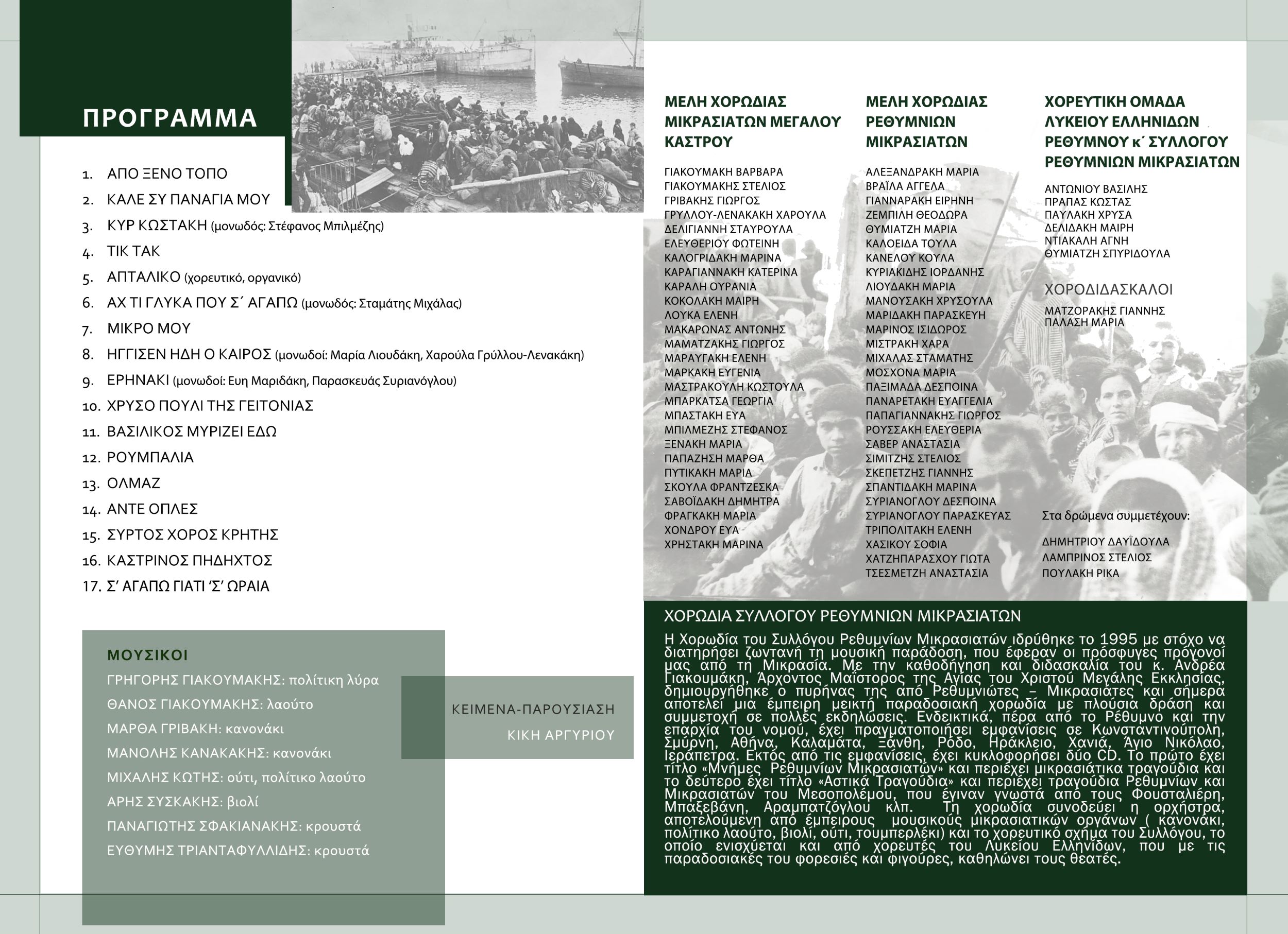 Συμπράττουν οι χορωδίες Ρεθυμνίων Μικρασιατών και Μικρασιατών Μεγάλου Κάστρου υπό την επιμέλεια, διδασκαλία και διεύθυνση του Άρχοντος Μαΐστωρος της Αγίας του Χριστού Μεγάλης Εκκλησίας, πρωτοψάλτου του Ιερού Ναού Αγίου Τίτου Ηρακλείου Δρ. Ανδρέα Γιακουμάκη.