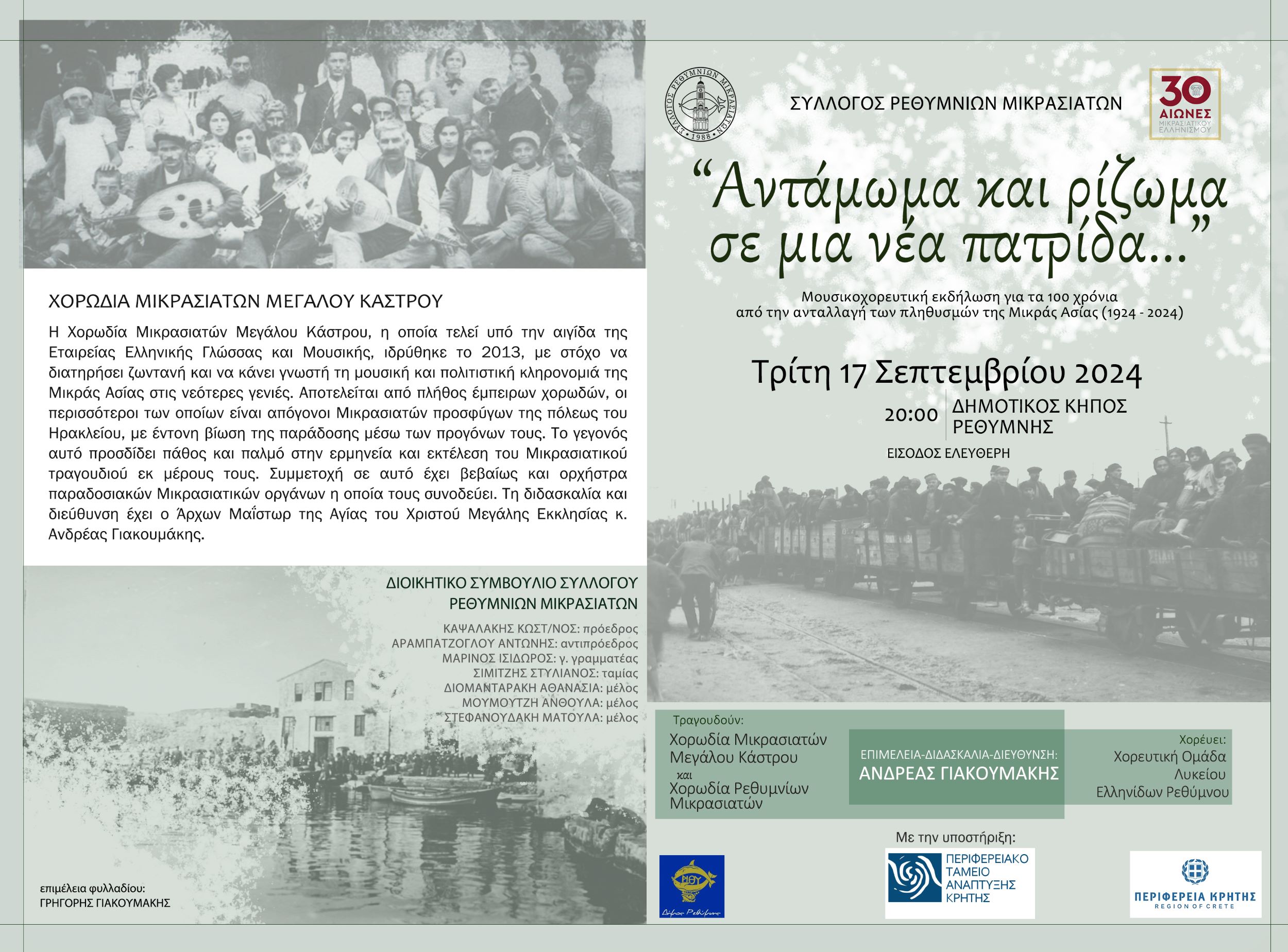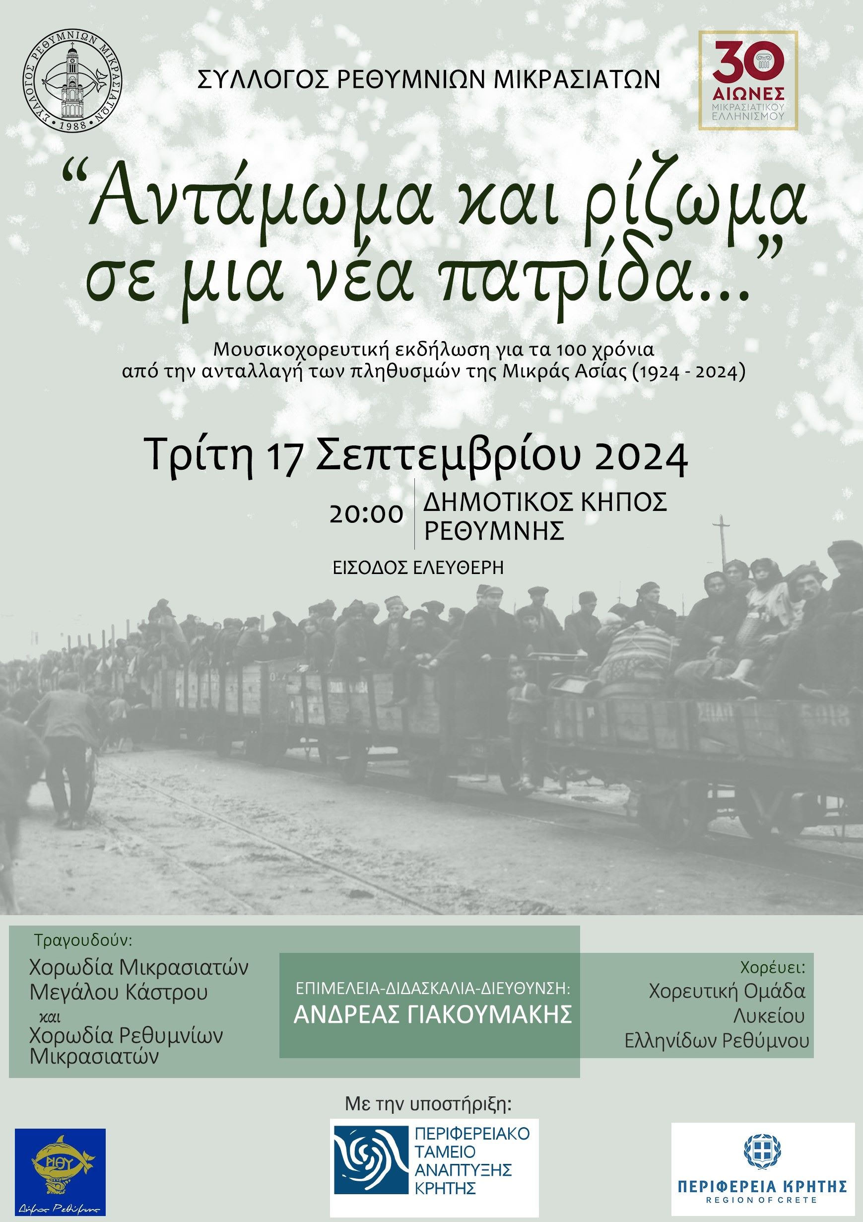 Η Εταιρεία Ελληνικής Γλώσσας και Μουσικής διοργανώνει με τη στήριξη της Περιφέρειας Κρήτης, τη μουσικοχορευτική εκδήλωση « Αντάμωμα και ρίζωμα σε μια νέα πατρίδα» με αφορμή τη συμπλήρωση 100 ετών από την ανταλλαγή των πληθυσμών της Μικράς Ασίας (1924 – 2024).