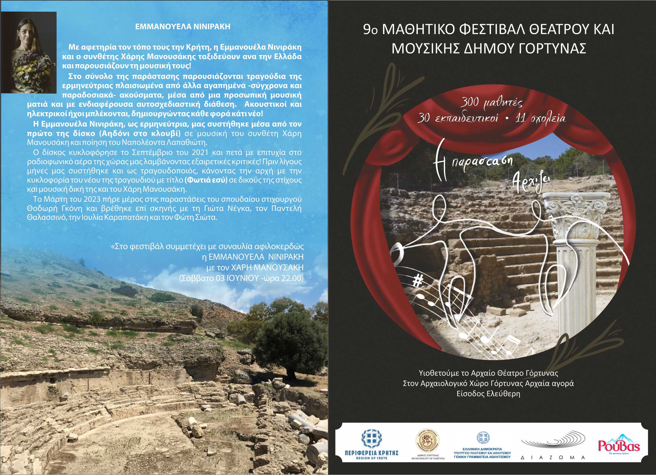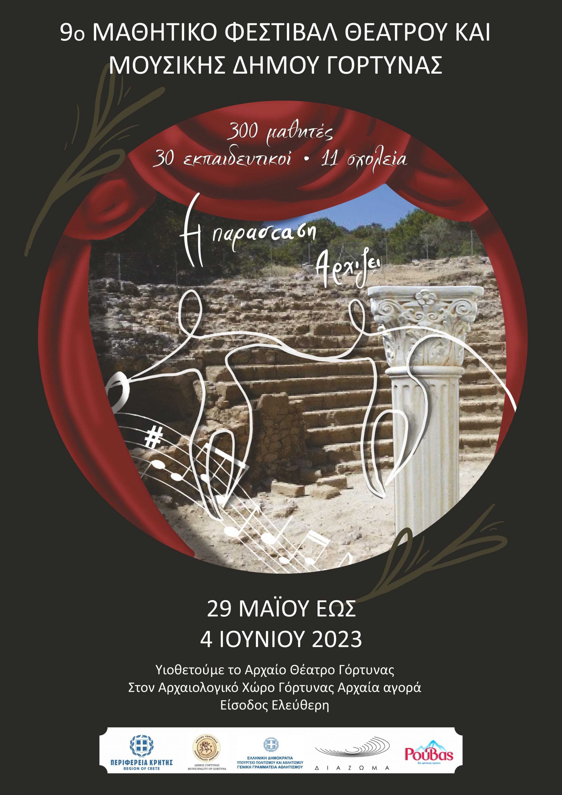 Ο Δήμος Γόρτυνας, το Υπουργείο Πολιτισμού και Αθλητισμού – Εφορεία Αρχαιοτήτων Ηρακλείου, η Περιφέρεια Κρήτης και το Σωματείο «Διάζωμα» συνδιοργανώνουν το 9ο Μαθητικό Φεστιβάλ Θεάτρου και Μουσικής Δήμου Γόρτυνας, στον αρχαιολογικό χώρο της Γόρτυνας (Αρχαία Αγορά), από την Δευτέρα 29 Μαΐου έως το Σάββατο 4 Ιουνίου 2023.