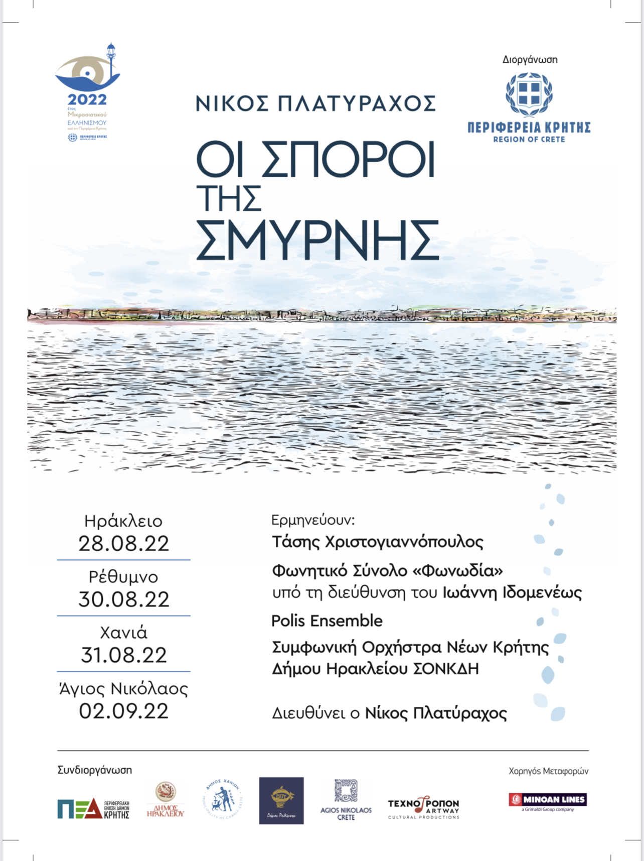 H Περιφέρεια Κρήτης, στο πλαίσιο του Έτους Μικρασιατικού Ελληνισμού, όπως έχει χαρακτηρίσει το 2022, παρουσιάζει σε τέσσερις παραστάσεις το πρωτότυπο έργο «ΟΙ ΣΠΟΡΟΙ ΤΗΣ ΣΜΥΡΝΗΣ»  του Νίκου Πλατύραχου, τιμώντας τον προσφυγικό Ελληνισμό της Κρήτης.