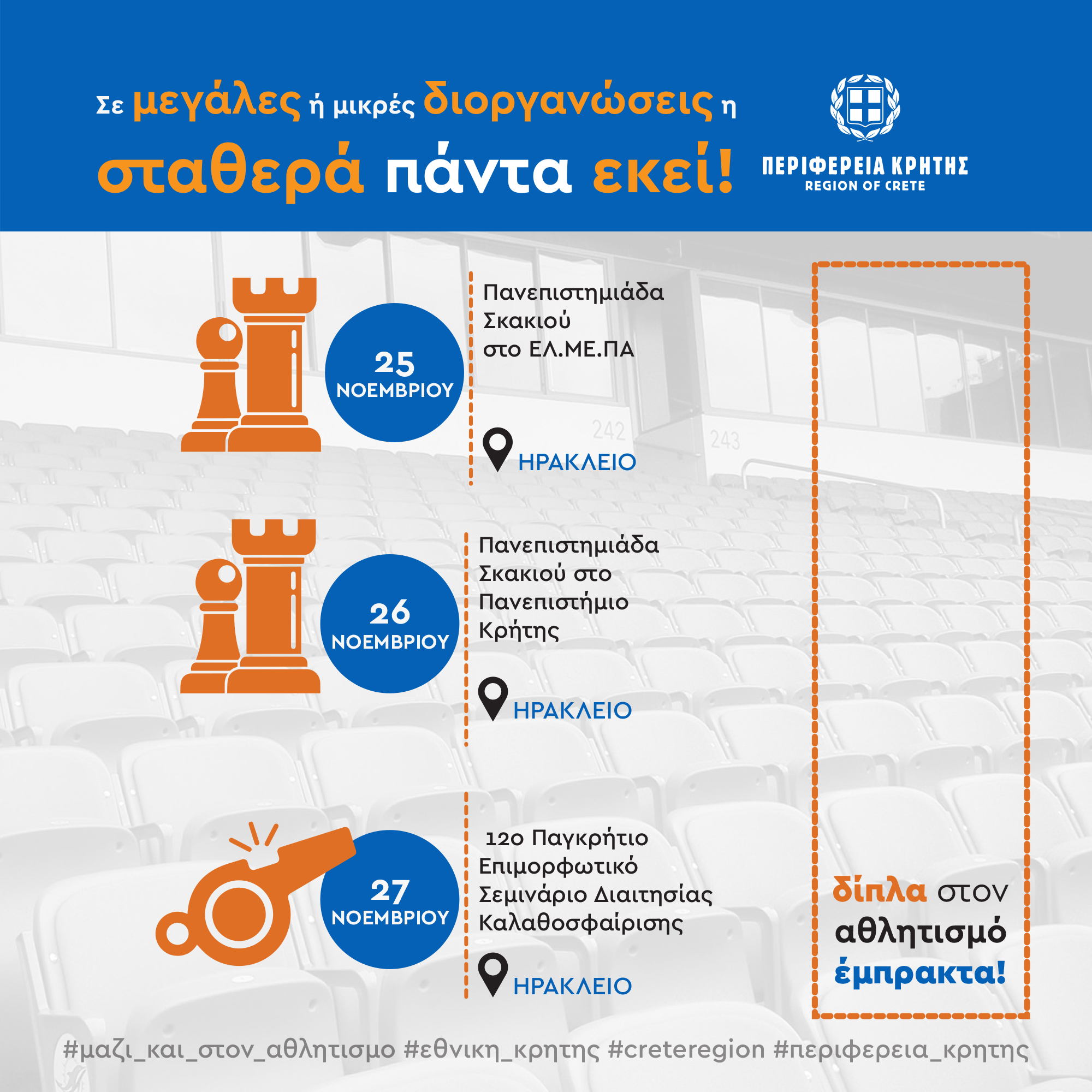 Στις 25 Νοεμβρίου θα πραγματοποιηθεί η πανεπιστημιάδα σκακιού στο κλειστό γυμναστήριο «Μάρκος Καραναστάσης» του Ελληνικού Μεσογειακού Πανεπιστημίου. Στις 26 Νοεμβρίου θα πραγματοποιηθεί η πανεπιστημιάδα σκακιού, στις εγκαταστάσεις του κλειστού πανεπιστημιακού γυμναστηρίου στο Ηράκλειο. Τέλος στις 27 Νοεμβρίου θα πραγματοποιηθεί το 12ο παγκρήτιο επιμορφωτικό σεμινάριο διαιτησίας καλαθοσφαίρισης  στην αίθουσα «Πειραματικού Θεάτρου» του νέου πολιτιστικού συνεδριακού κέντρου Ηρακλείου.