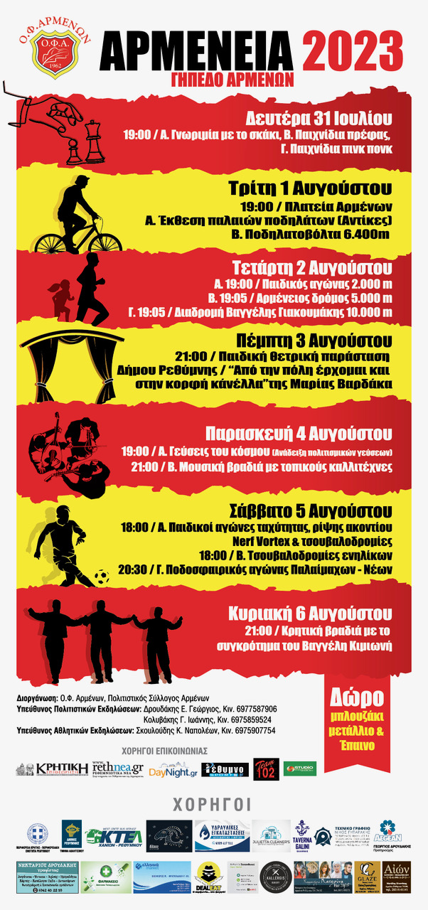 O Όμιλος Φιλάθλων Αρμένων (Ο.Φ.Α), ο Πολιτιστικός Σύλλογος Αρμένων με την υποστήριξη της Περιφέρειας Κρήτης διοργανώνουν από σήμερα 31 Ιουλίου έως και τις 6 Αυγούστου τις αθλητικές-πολιτιστικές εκδηλώσεις «ΑΡΜΕΝΕΙΑ 2023».