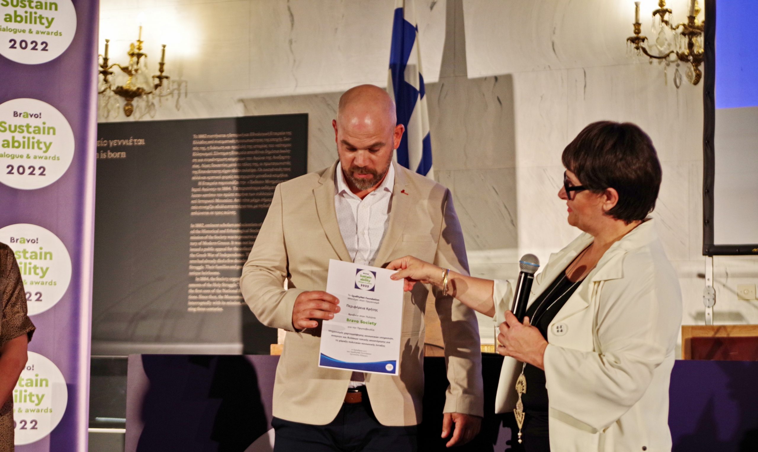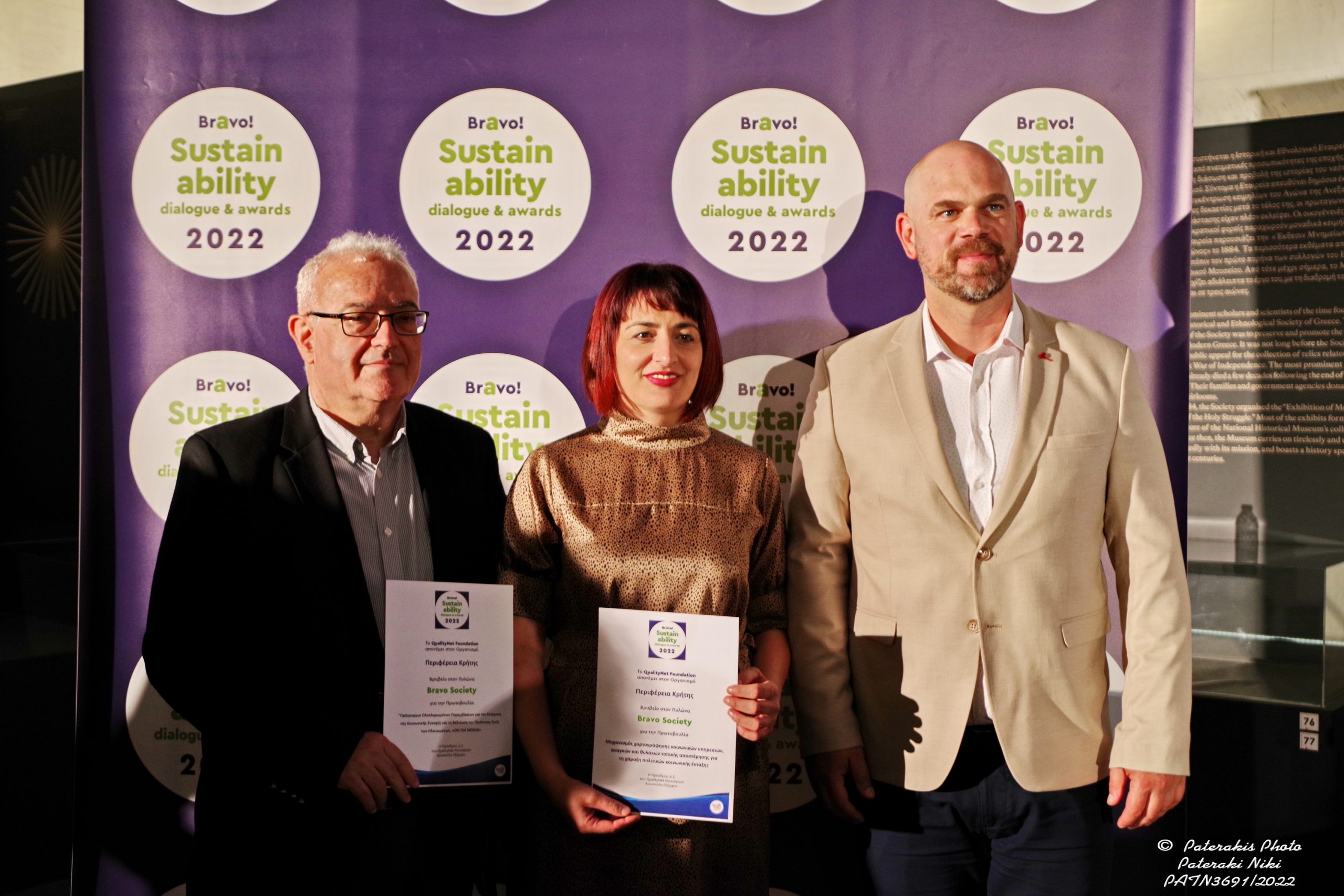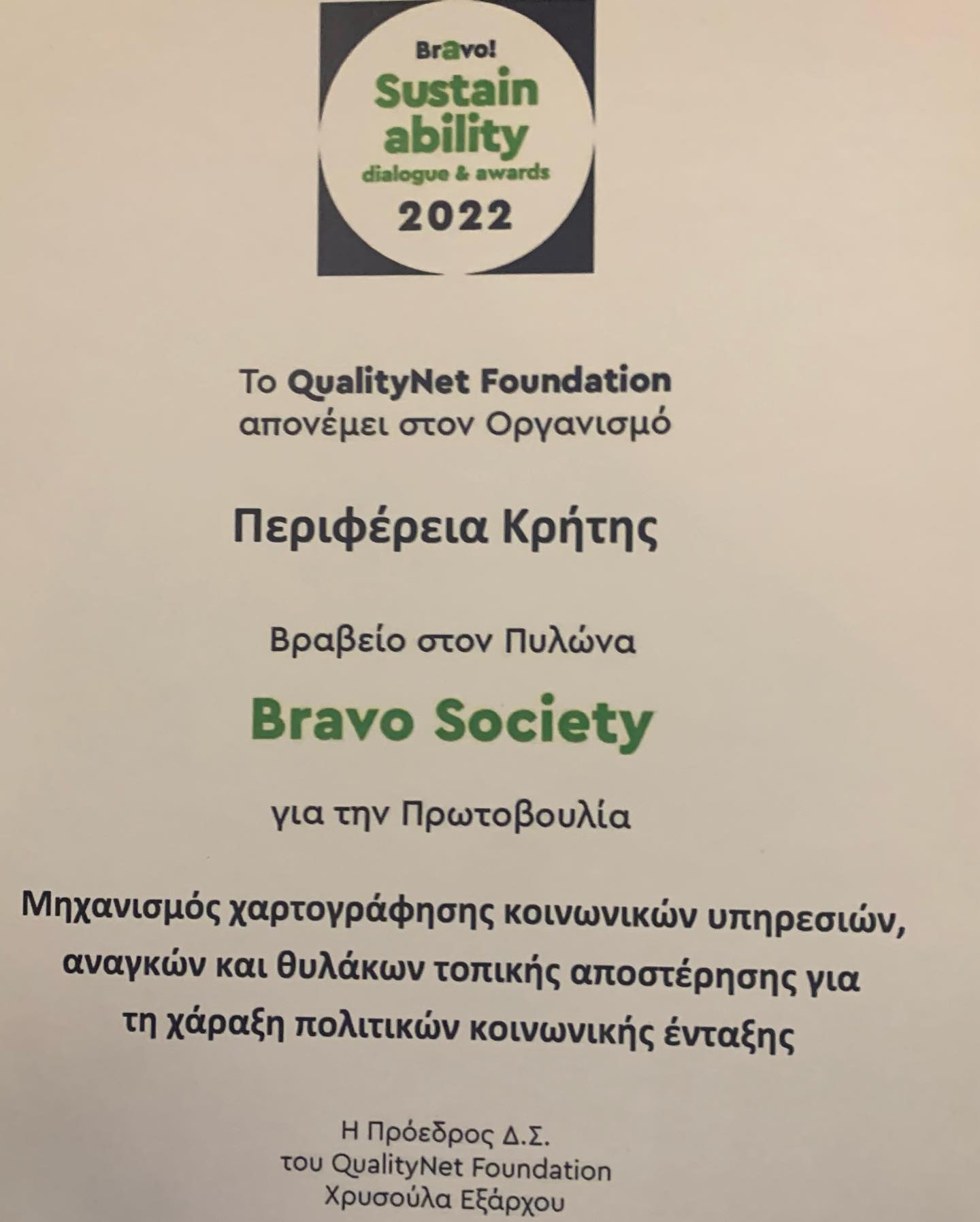 Μία πολύ σημαντική διάκριση απέσπασε η Περιφέρεια Κρήτης στη φετινή τελετή απονομής Bravo Sustainability Awards 2022, η οποία πραγματοποιήθηκε στο Μέγαρο της Παλιάς Βουλής, στο πλαίσιο της Εβδομάδας Βιώσιμης Ανάπτυξης Bravo Sustainability Week 2022, που διοργανώνεται από το QualityNet Foundation. H διάκριση αφορά τον Πυλώνα ΚΟΙΝΩΝΙΑ (BRAVO SOCIETY), για τη Δράση: «Μηχανισμός χαρτογράφησης (mapping) κοινωνικών υπηρεσιών, αναγκών και θυλάκων τοπικής αποστέρησης για τη χάραξη πολιτικών κοινωνικής ένταξης στην Περιφέρεια Κρήτης», του Περιφερειακού Παρατηρητηρίου Κοινωνικής Ένταξης, η οποία υποστηρίζεται από το Εργαστήριο Κοινωνικής Ανάλυσης και Εφαρμοσμένης Κοινωνικής Έρευνας (ΕΚΑΕΚΕ) του Τμήματος Κοινωνιολογίας του Πανεπιστημίου Κρήτης.