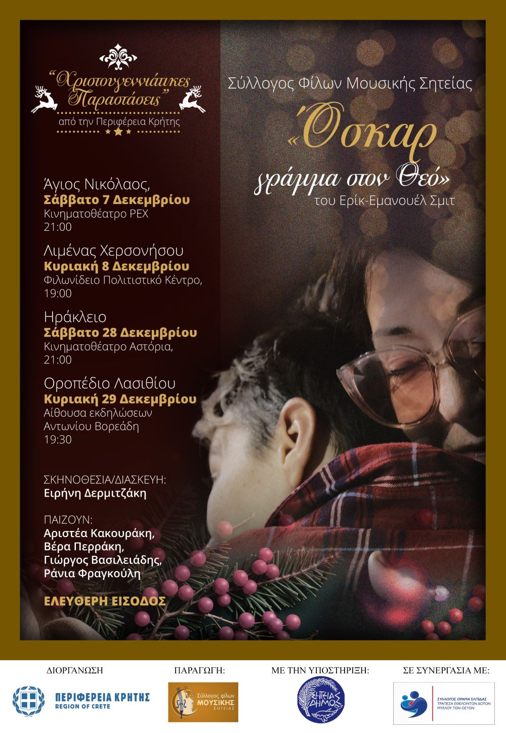 Η Περιφέρειας Κρήτης, σε συνεργασία με τον Σύλλογο Φίλων Μουσικής Σητείας και την θεατρική του ομάδα, παρουσιάζουν τη βραβευμένη θεατρική παράσταση σε δύο Πανελλήνια φεστιβάλ θεάτρου, «Όσκαρ γράμμα στον Θεό» του Ερίκ-Εμανουέλ Σμιτ, σε σκηνοθεσία Ειρήνης Δερμιτζάκη, στον Άγιο Νικόλαο, στη Χερσόνησο, στο Ηράκλειο και στο Οροπέδιο Λασιθίου, με ελεύθερη είσοδο για το κοινό.