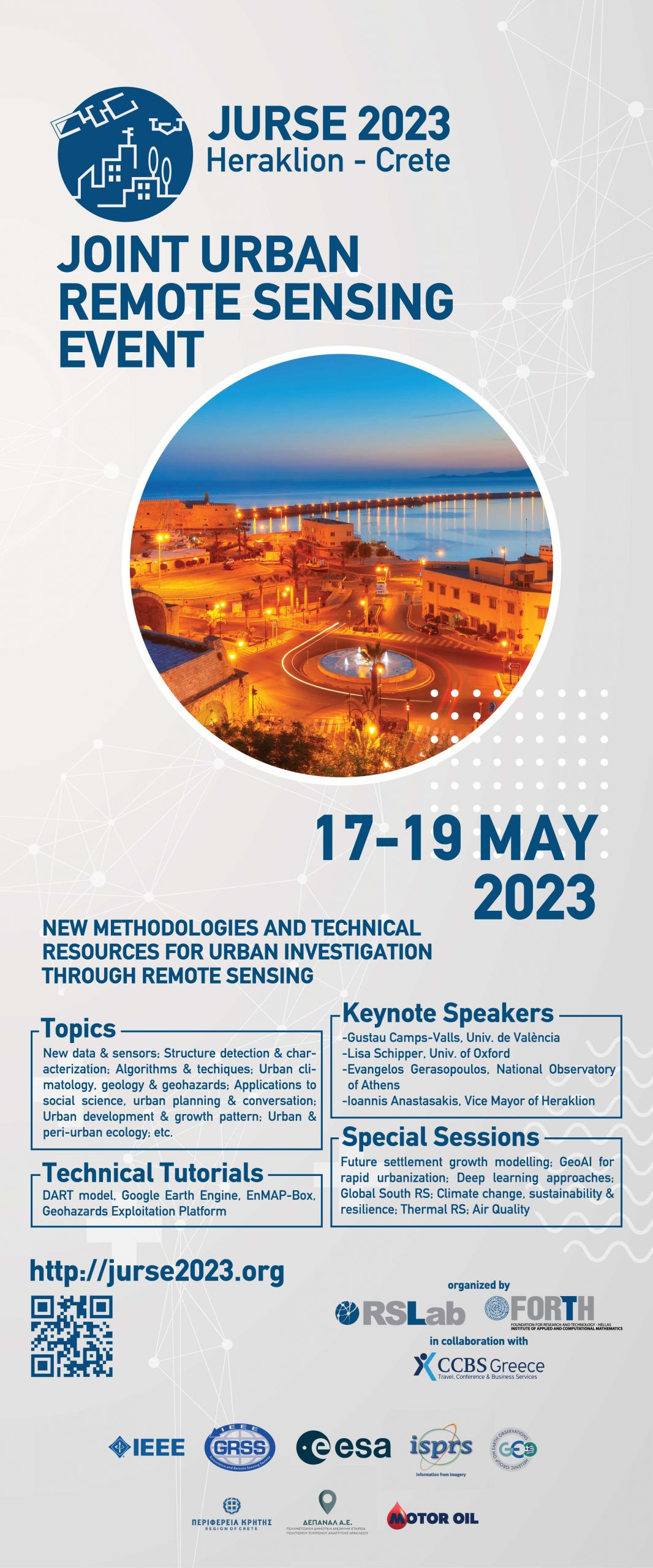 Το Εργαστήριο Τηλεπισκόπησης και Εφαρμογών σε Αστικό και Φυσικό Περιβάλλον (http://rslab.gr) του Ινστιτούτου Υπολογιστικών Μαθηματικών του Ιδρύματος Τεχνολογίας και Έρευνας (ΙΤΕ), σε συνεργασία με την εταιρεία CCBS Greece, διοργανώνουν, στο Πολιτιστικό – Συνεδριακό Κέντρο Ηρακλείου, το Διεθνές Συμπόσιο “Joint Urban and Remote Sensing Event – JURSE2023” (http://jurse2023.org), από 17 ως 19 Μαΐου. Το Συνέδριο αφορά σε σύγχρονες τεχνολογίες Παρατήρησης της Γης για το Αστικό Περιβάλλον, με έμφαση στο Αστικό Κλίμα, στον Αστικό και Πολεοδομικό Σχεδιασμό, στην Αστική Ανθεκτικότητα, καθώς και στην παρακολούθηση και την αποτίμηση της αποτελεσματικότητας δράσεων και παρεμβάσεων στο Αστικό Περιβάλλον που αφορούν τόσο στην Προσαρμογή στην Κλιματική Αλλαγή, όσο και στον Μετριασμό αυτής. Στις 16 Μαΐου έχει προγραμματιστεί σειρά σεμιναρίων για μεταπτυχιακούς φοιτητές και Υποψήφιους Διδάκτορες.