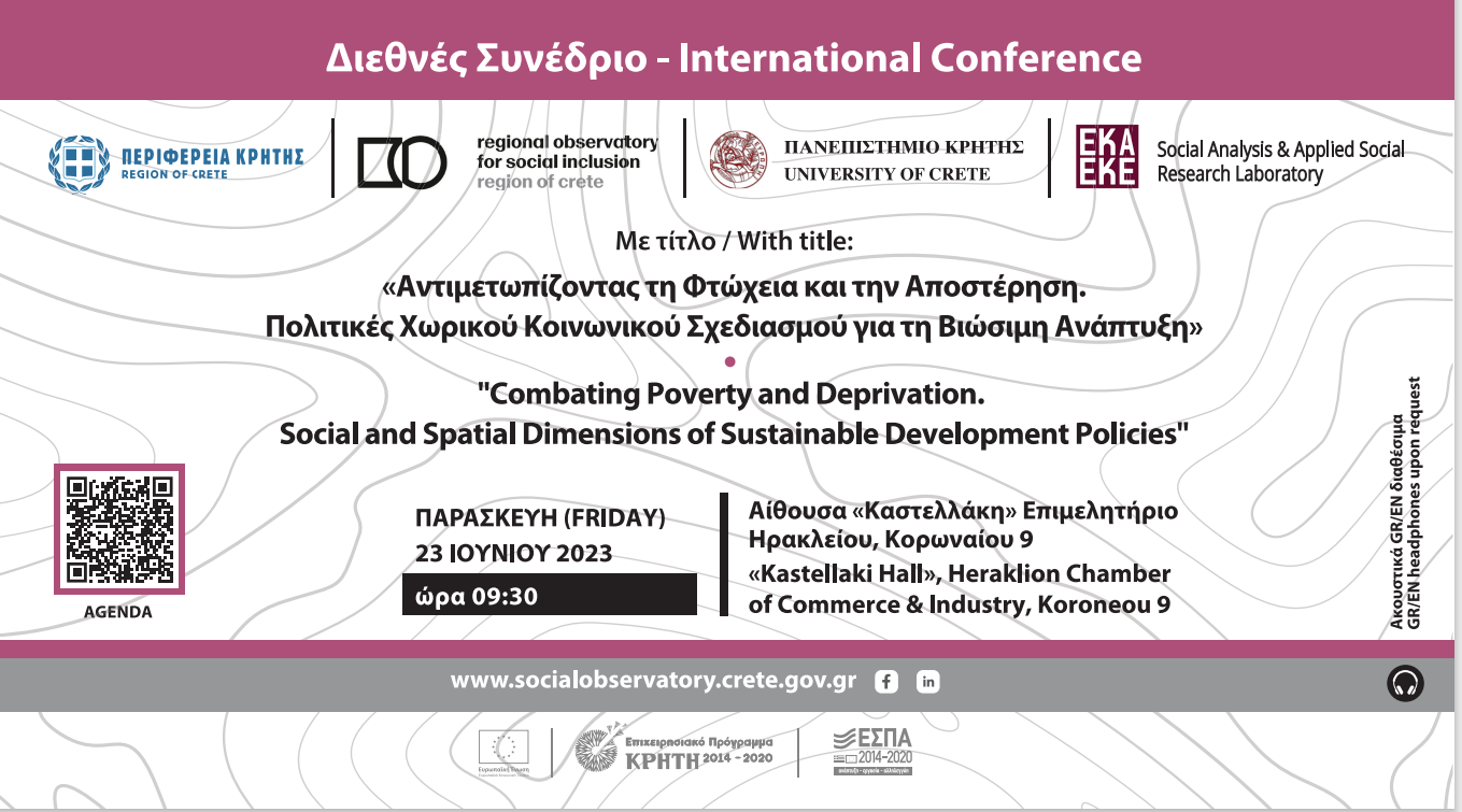 Η Περιφέρεια Κρήτης διοργανώνει Διεθνές Συνέδριο με τίτλο, «Αντιμετωπίζοντας τη Φτώχεια και την Αποστέρηση. Πολιτικές Χωρικού Κοινωνικού Σχεδιασμού για τη Βιώσιμη Ανάπτυξη», την Παρασκευή, 23 Ιουνίου 2023, 09:00-18.30, στην αίθουσα «Καστελλάκη» του Επιμελητηρίου Ηρακλείου. Το Συνέδριο πραγματοποιείται από το Περιφερειακό Παρατηρητήριο Κοινωνικής Ένταξης (Παρατηρητήριο) σε συνεργασία με το Εργαστήριο Κοινωνικής Ανάλυσης και Εφαρμοσμένης Κοινωνικής Έρευνας (ΕΚΑΕΚΕ) του Τμήματος Κοινωνιολογίας του Πανεπιστημίου Κρήτης.