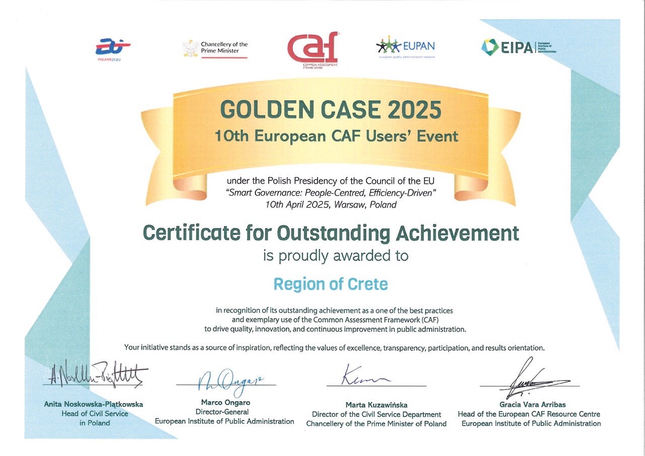 Με μία σημαντική διεθνή διάκριση τιμήθηκε η Περιφέρεια Κρήτης στο 10ο Συνέδριο του Κοινού Πλαισίου Αξιολόγησης (CAF–Common Assessment Framework), το οποίο πραγματοποιήθηκε στη Βαρσοβία, στο πλαίσιο της Ευρωπαϊκής Προεδρίας της Πολωνίας και διοργανώθηκε από το Ευρωπαϊκό Ινστιτούτο Δημόσιας Διοίκησης του Μάαστριχτ.