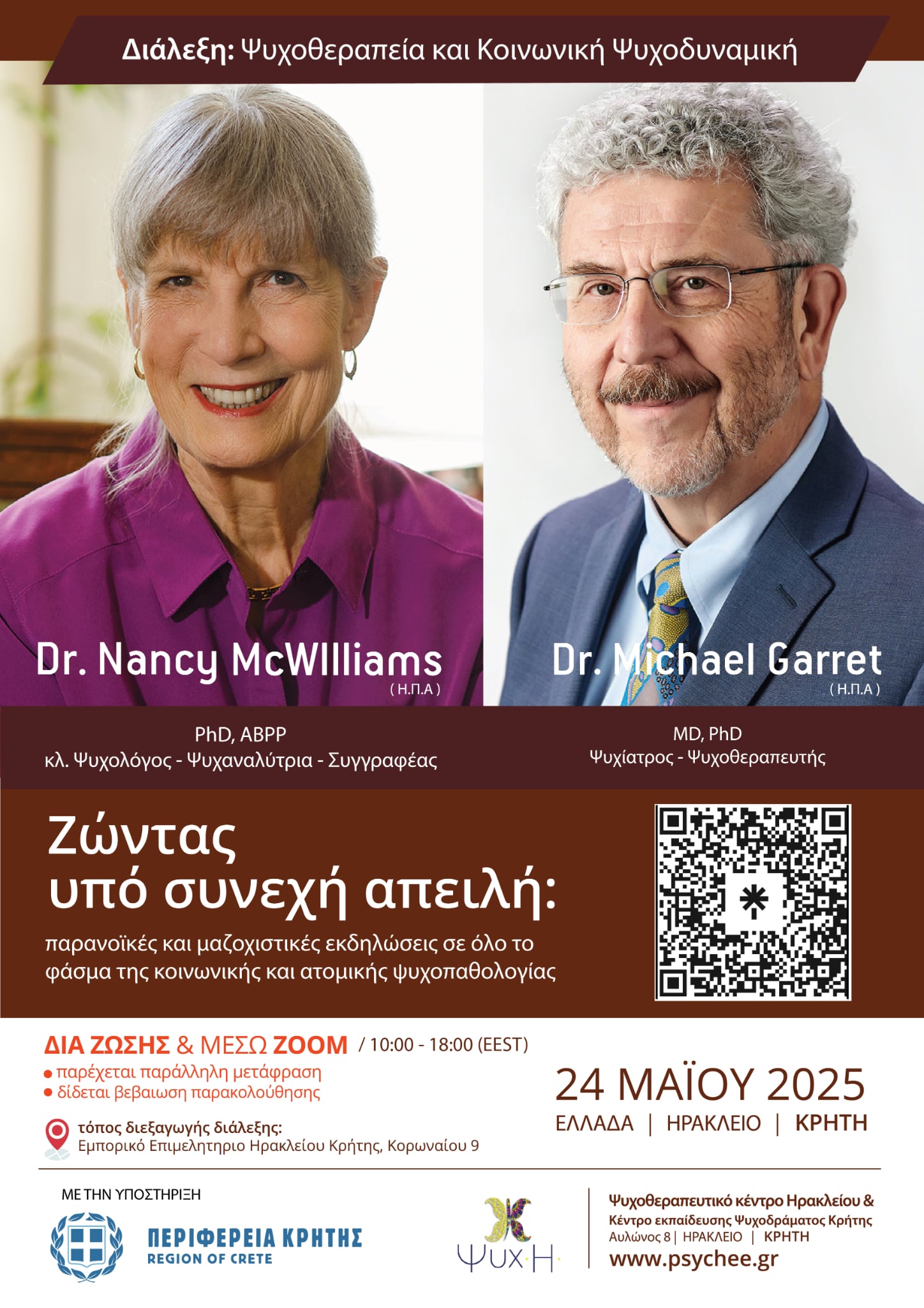 Οι διακεκριμένοι ψυχοθεραπευτές από τις Ηνωμένες Πολιτείες – η παγκοσμίως αναγνωρισμένη ψυχαναλύτρια και συγγραφέας Dr. Nancy McWilliams και ο ψυχίατρος Dr. Michael Garrett – συναντώνται στο Ηράκλειο για μία διάλεξη υψηλού επιστημονικού επιπέδου.
