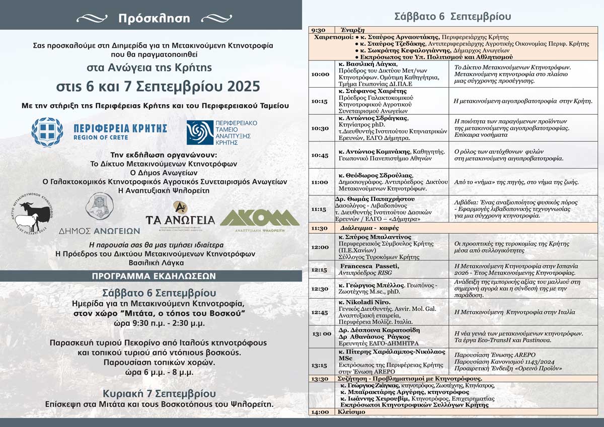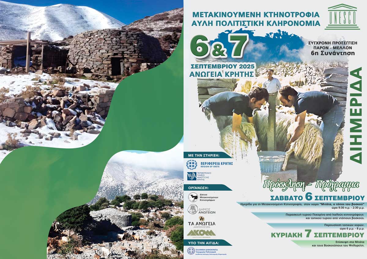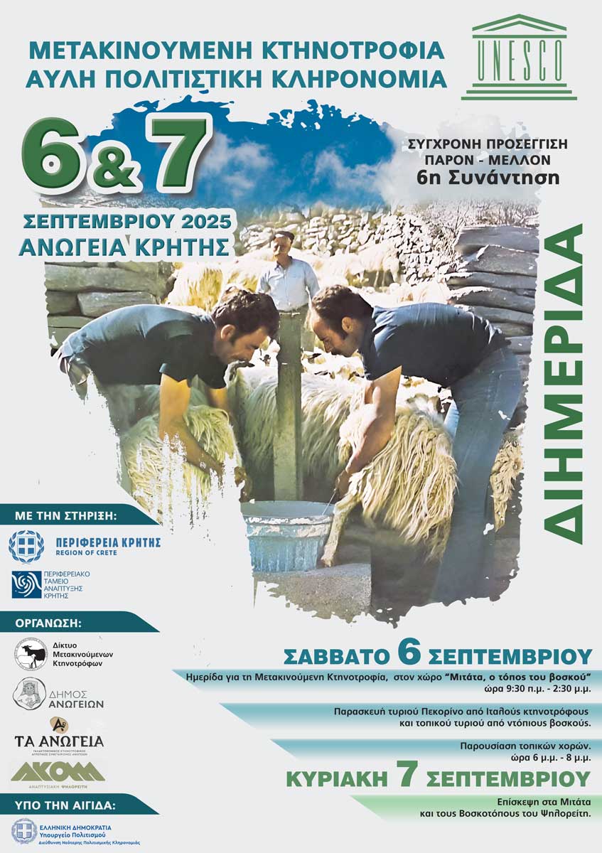 H Περιφέρεια Κρήτης, ο Δήμος Ανωγείων και το Δίκτυο Μετακινούμενων Κτηνοτρόφων σε συνεργασία με το Γαλακτοκομικό Κτηνοτροφικό Αγροτικό Συνεταιρισμό Ανωγείων, τον ΑΚΟΜΜ και το Περιφερειακό Ταμείο Ανάπτυξης Κρήτης, διοργανώνουν Διημερίδα με θέμα: «Μετακινούμενη Κτηνοτροφία – Άυλη Πολιτιστική Κληρονομιά» στις 6 και 7 Σεπτεμβρίου στα Ανώγεια, στο χώρο: «Μιτάτα, ο τόπος του βοσκού», στις 9:30 το πρωί.