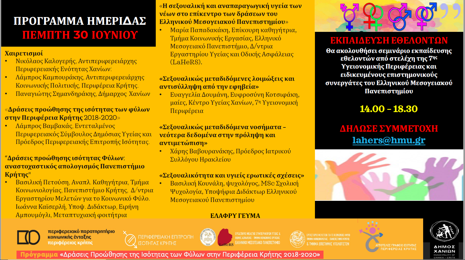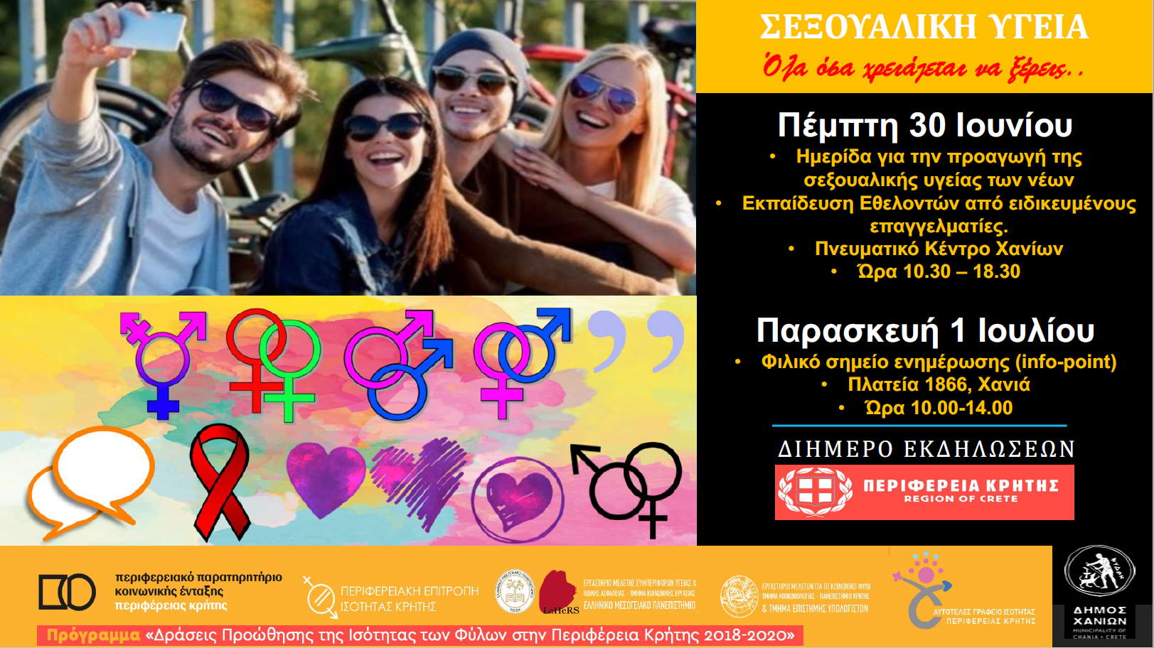 Η Περιφέρεια Κρήτης (Περιφερειακό Παρατηρητήριο Κοινωνικής Ένταξης, Περιφερειακή Επιτροπή Ισότητας των Φύλων Κρήτης-ΠΕΠΙΣ, Αυτοτελές Γραφείο Ισότητας), το Εργαστήριο Μελέτης Συμπεριφορών Υγείας και Οδικής Ασφάλειας του Ελληνικού Μεσογειακού Πανεπιστημίου και το Πανεπιστήμιο Κρήτης, σε συνεργασία με το Δήμο Χανίων και το Κέντρο Υγείας Χανίων της 7ης Υγειονομικής Περιφέρειας συνδιοργανώνουν διήμερο δράσεων για την προαγωγή της σεξουαλικής και αναπαραγωγικής υγείας των νέων. Οι δράσεις πραγματοποιούνται στο πλαίσιο της Προγραμματικής Σύμβασης «Δράσεις Προώθησης της Ισότητας των Φύλων στην Περιφέρεια Κρήτης 2018-2020», που υλοποιείται από την Περιφέρεια Κρήτης, το Πανεπιστήμιο Κρήτης και το Ελληνικό Μεσογειακό Πανεπιστήμιο.