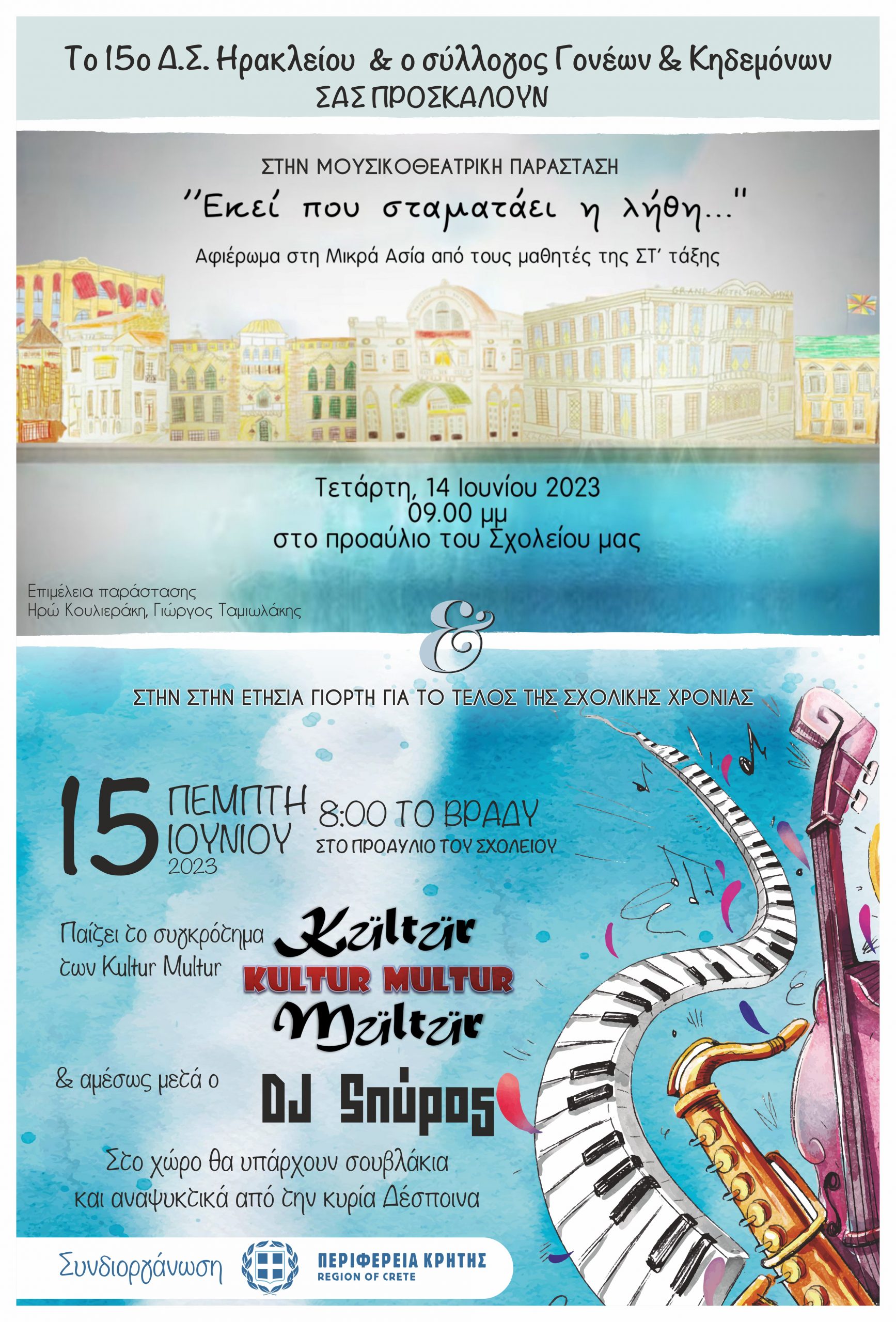 Στις 14 Ιουνίου ημέρα Τετάρτη 9:00 το βράδυ στο προαύλιο του σχολείου  θα πραγματοποιηθεί η μουσικοθεατρική παράσταση με τίτλο “εκεί που σταματάει η λήθη”. Πρόκειται για ένα αφιέρωμα στη Μικρά Ασία από τους μαθητές της έκτης τάξης. Την παράσταση επιμελούνται οι δάσκαλοι του σχολείου  Ηρώ Κουλιεράκη και Γιώργος Ταμιωλάκης