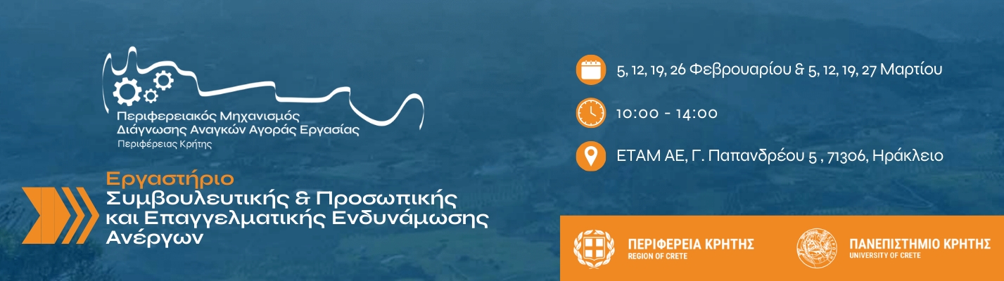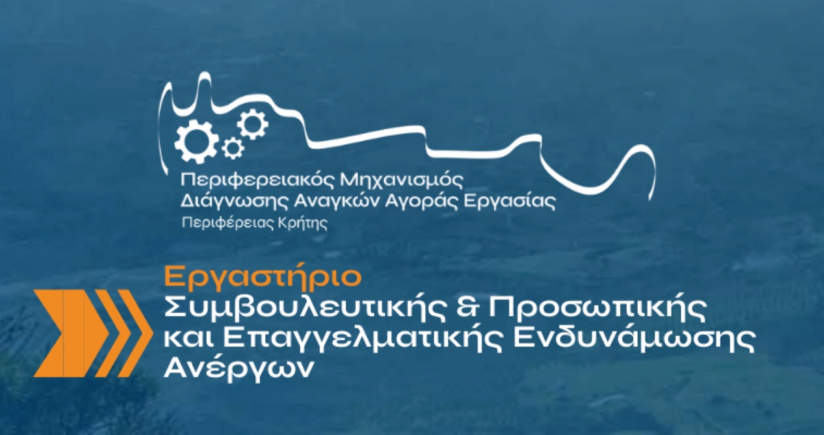 Πρόσκληση συμμετοχής σε βιωματικό «Εργαστήριο Συμβουλευτικής & Προσωπικής και Επαγγελματικής Ενδυνάμωσης», απευθύνει η Περιφέρεια Κρήτης, στο πλαίσιο των δράσεων του Περιφερειακού Μηχανισμού Διάγνωσης Αναγκών Αγοράς Εργασίας.